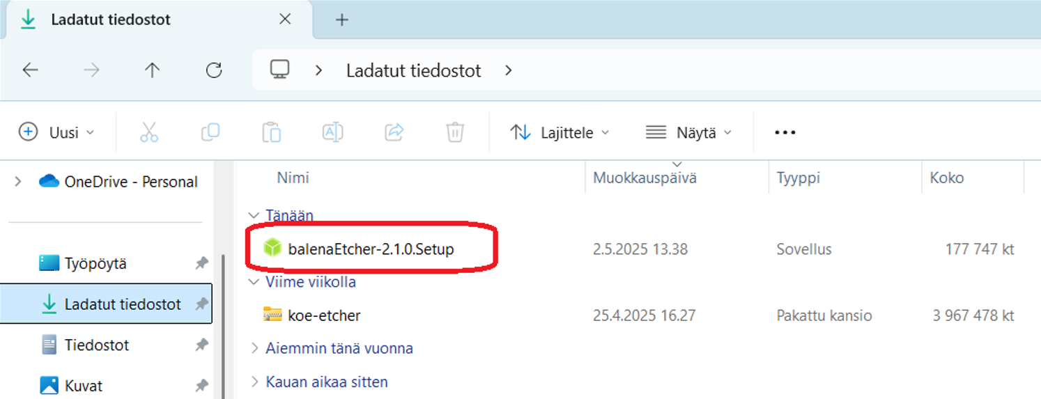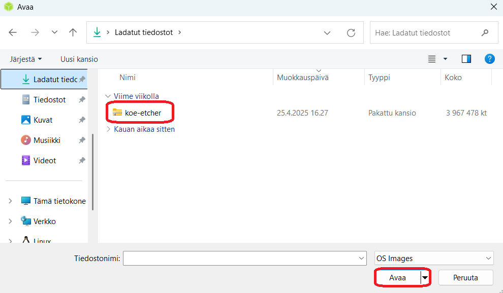 - Valitse Ladatut tiedostot -kohdasta koe-etcher.zip ja klikkaa Avaa tai tuplaklikkaa kahdesti koe-etcher.zip-pakattua kansiota.