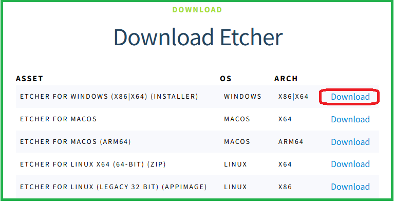 - Siirry sivulla alemmas tai klikkaa Download Etcher.