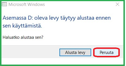 - Jos näytölle tulee ilmoitusikkuna, että Asemassa D: (tai jokin muu asema) oleva levy täytyy alustaa ennen sen käyttämistä, klikkaa Peruuta.