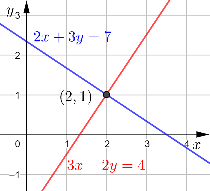 \[\begin{cases}2x+3y&=7\\3x-2y&=4\end{cases}\]