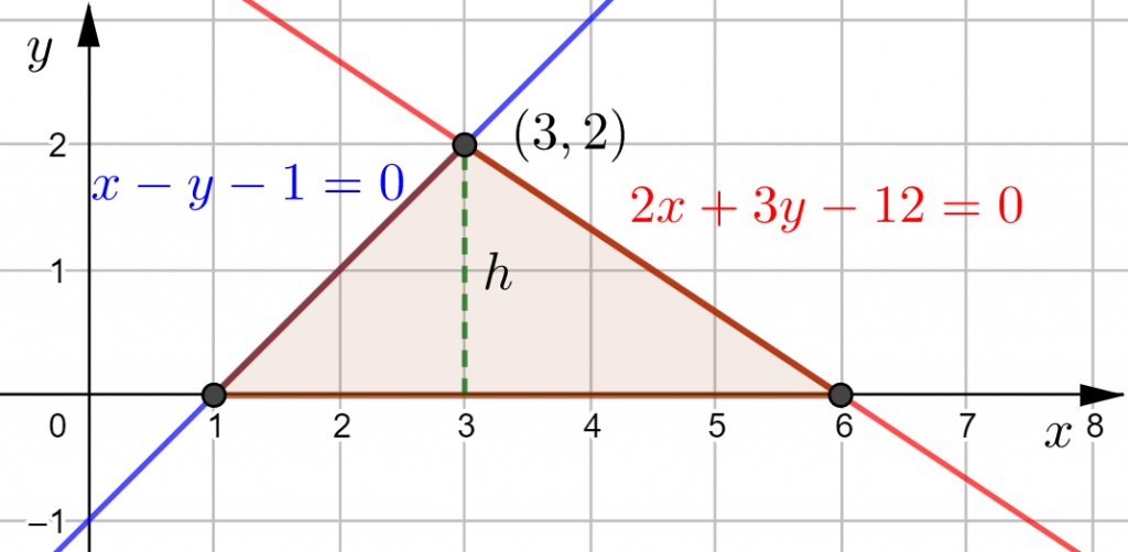Kolmion korkeus h saadaan suorien leikkauspisteen y-koordinaatista,