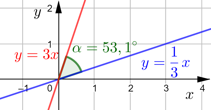 \begin{align*}\tan \alpha &=\left|\frac{3-\dfrac{1}{3}}{1+3 \cdot \dfrac{1}{3}}\right| \\  \tan \alpha &=\left|\frac{^{\text{3)}} 3-\dfrac{1}{3}}{1+1}\right| \\ \tan \alpha &=\left|\frac{\dfrac{9}{3}-\dfrac{1}{3}}{2}\right| \\\tan \alpha &=\left|\frac{\dfrac{8}{3}}{2}\right|\\\tan \alpha&=\left|\frac{4}{3}\right|\\ \tan \alpha&=\frac{4}{3}\\  \alpha &=53{,}13\ldots^{\circ} \approx 53{,}1^{\circ}\end{align*}