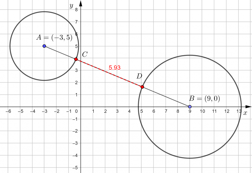 Ympyröiden välinen etäisyyden määrittämiseksi lasketaan ensin ympyröiden keskipisteiden etäisyys. Kun tästä vähennetään ympyröiden säteet (