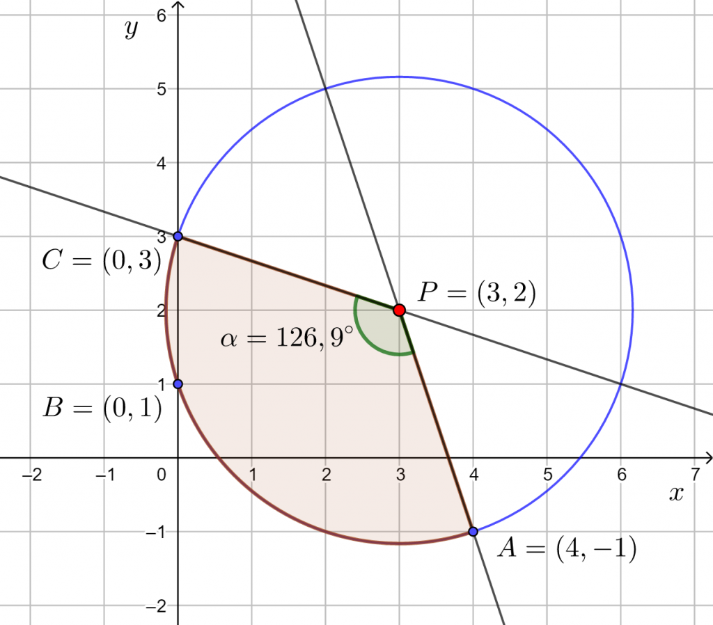 Ratkaisuna saatiin suorien välinen terävä kulma. Kuvion perusteella kulma on tylppä, joten kaarta