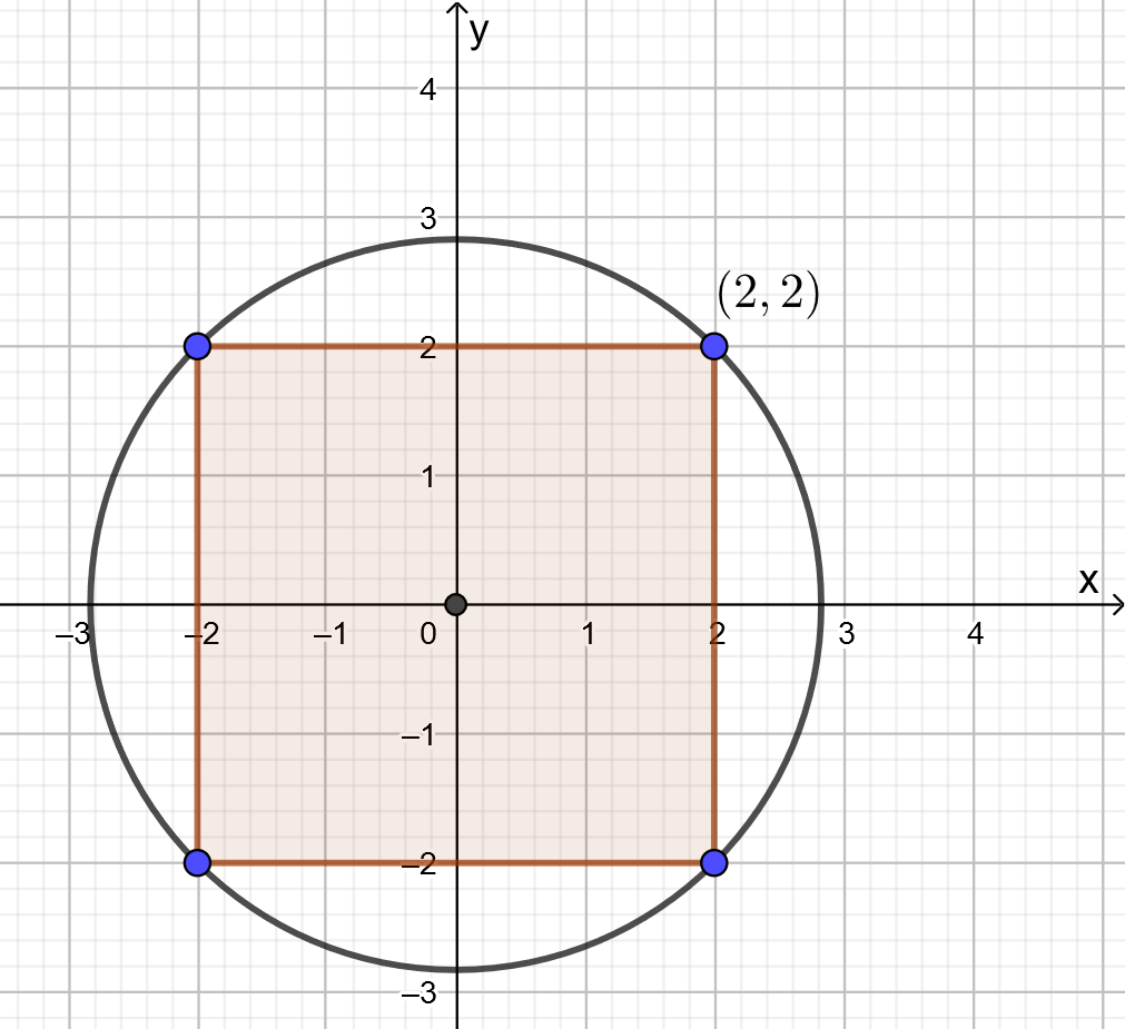 Ympyrän keskipiste on sama kuin neliön keskipiste eli origo