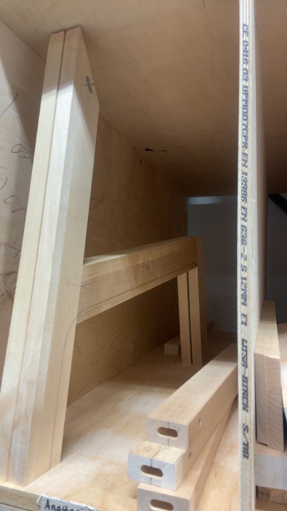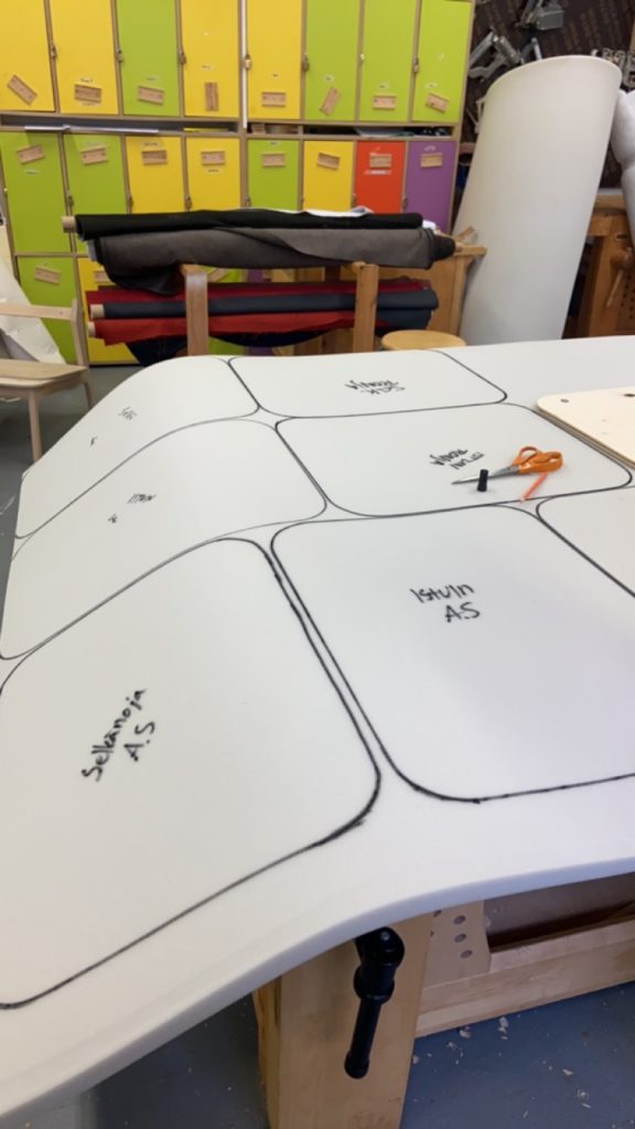 Levy halkaistaan sirkkelillä tuolin osiksi (etujalat, takajalat, sivusarjat, poikittaissarjat.)