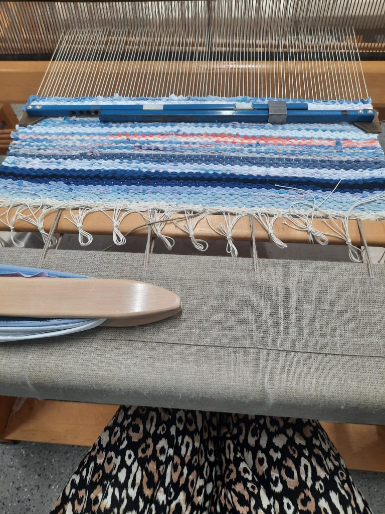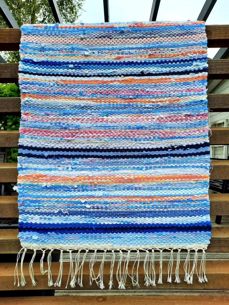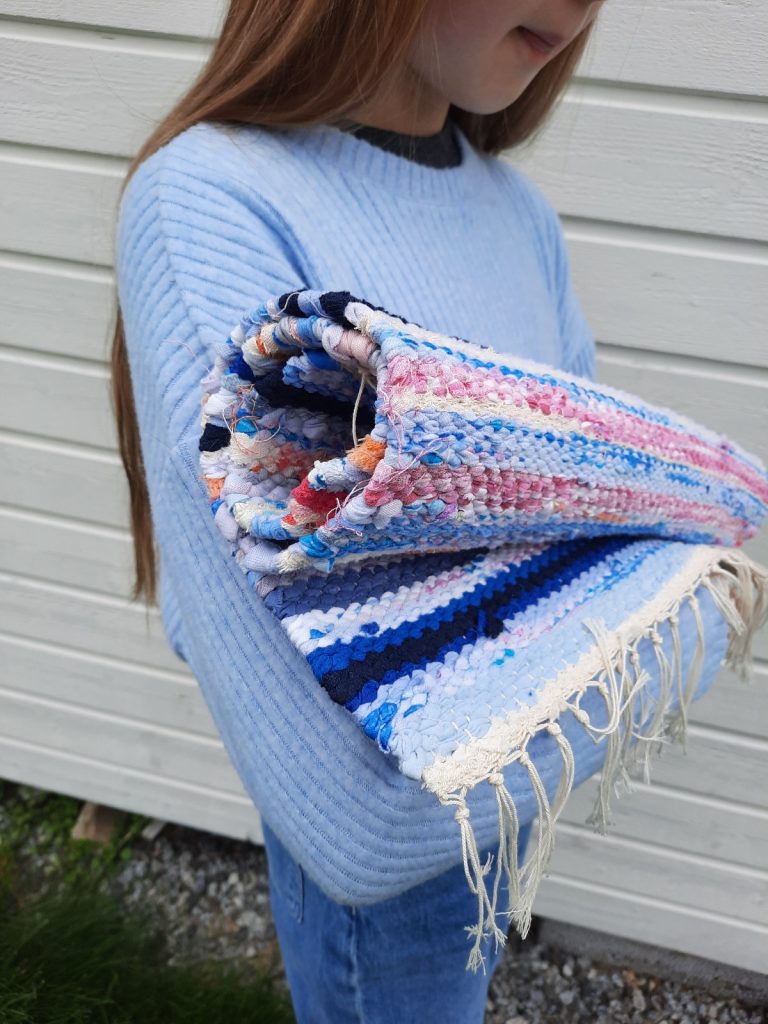 Seuraavana päivänä pääsin kutomaan mattoa, joka osoittautuikin todella hauskaksi hommaksi. Tuloksena oli raikkaan värinen matto, josta myöhemmin ompelen kassin. Tekstiilipuolen päivät saivat miettimään olisiko tämä sittenkin minun puoleni?