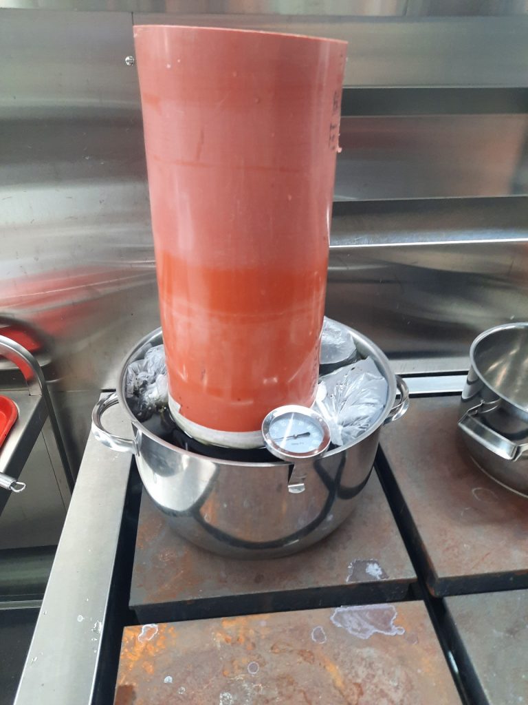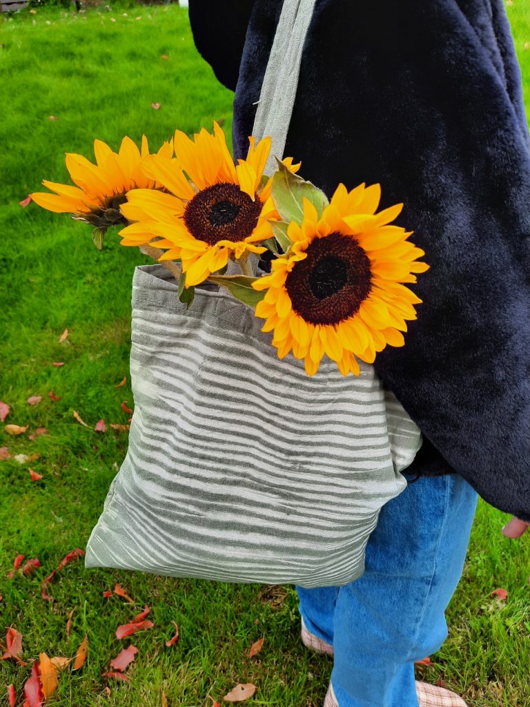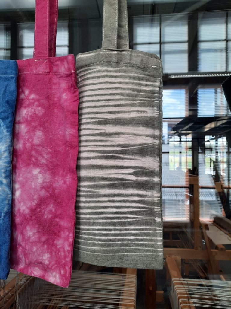 Seuraavaksi menimme kahdeksi päiväksi tekstiilipuolelle, jossa meidät jaettiin kahteen ryhmään. Toiset värjäsivät kangaskassit ja toiset pääsivät kutomaan 50 cm mattoa. Itse olin ensin värjäysryhmässä. Olen jonkun verran värjännyt vaatteita, joten halusin kokeilla vähän erilaista tekniikkaa. Päädyinkin sitomaan kassin tiukasti putken ympärille ja täyttämään kattilan vesipusseilla (jotta saimme vedenpinnan nousemaan tarpeeksi). Haastava valmistelutyö kannatti, sillä lopputuloksena oli tiikerinraidat kassissa.
