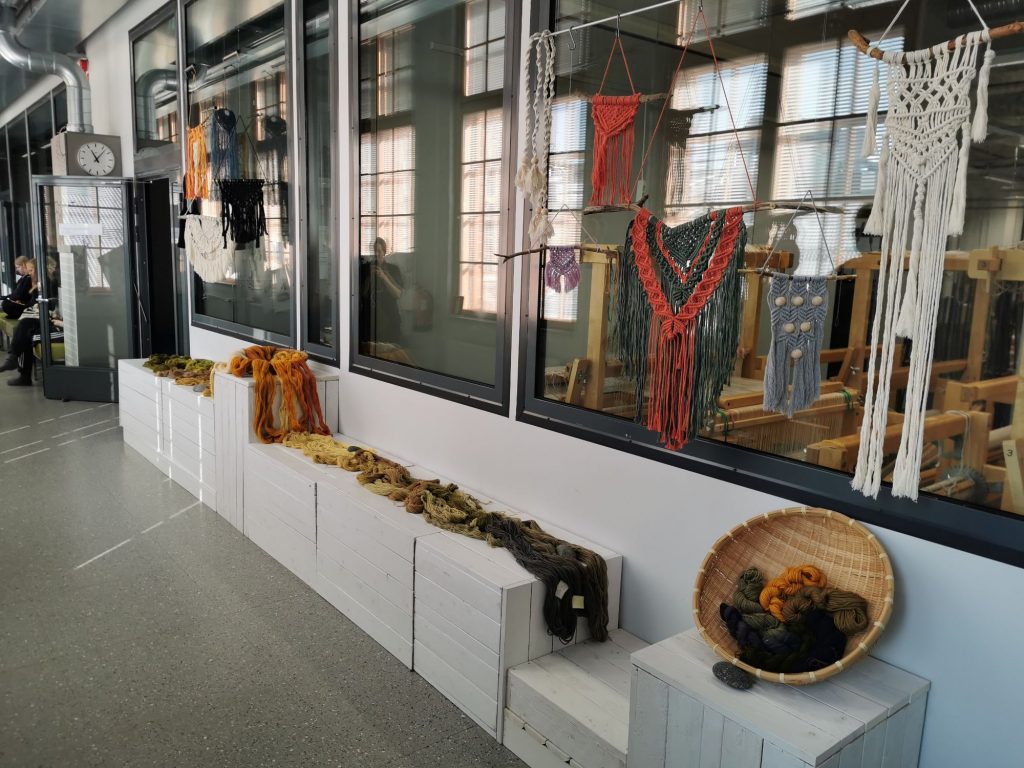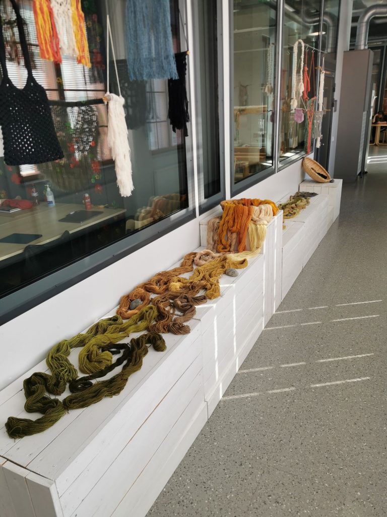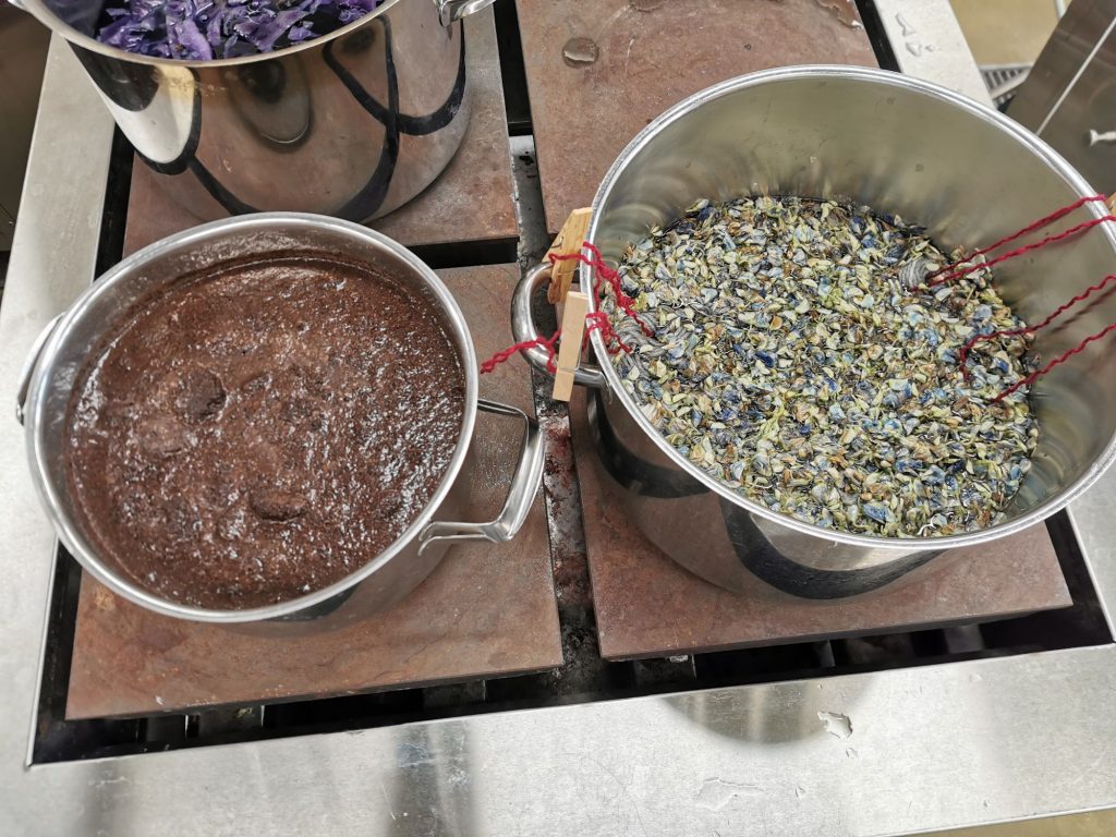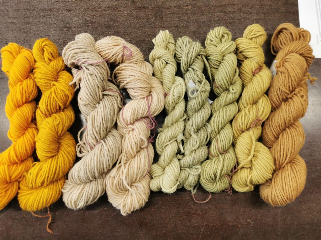 Keräsin kesällä pakastimeen lupiinin kukkia, koiranputkea sekä puna-ailakkia loman jälkeistä kasvivärjäyskurssia varten. Otin myös käytetyt kahvinpurut talteen. Värjäsin myös koululta saaduilla keltasipulin kuorilla sekä avokadon kuorilla ja kivillä.
