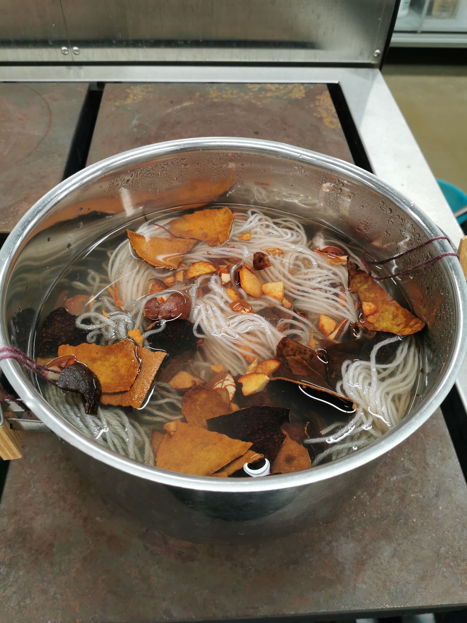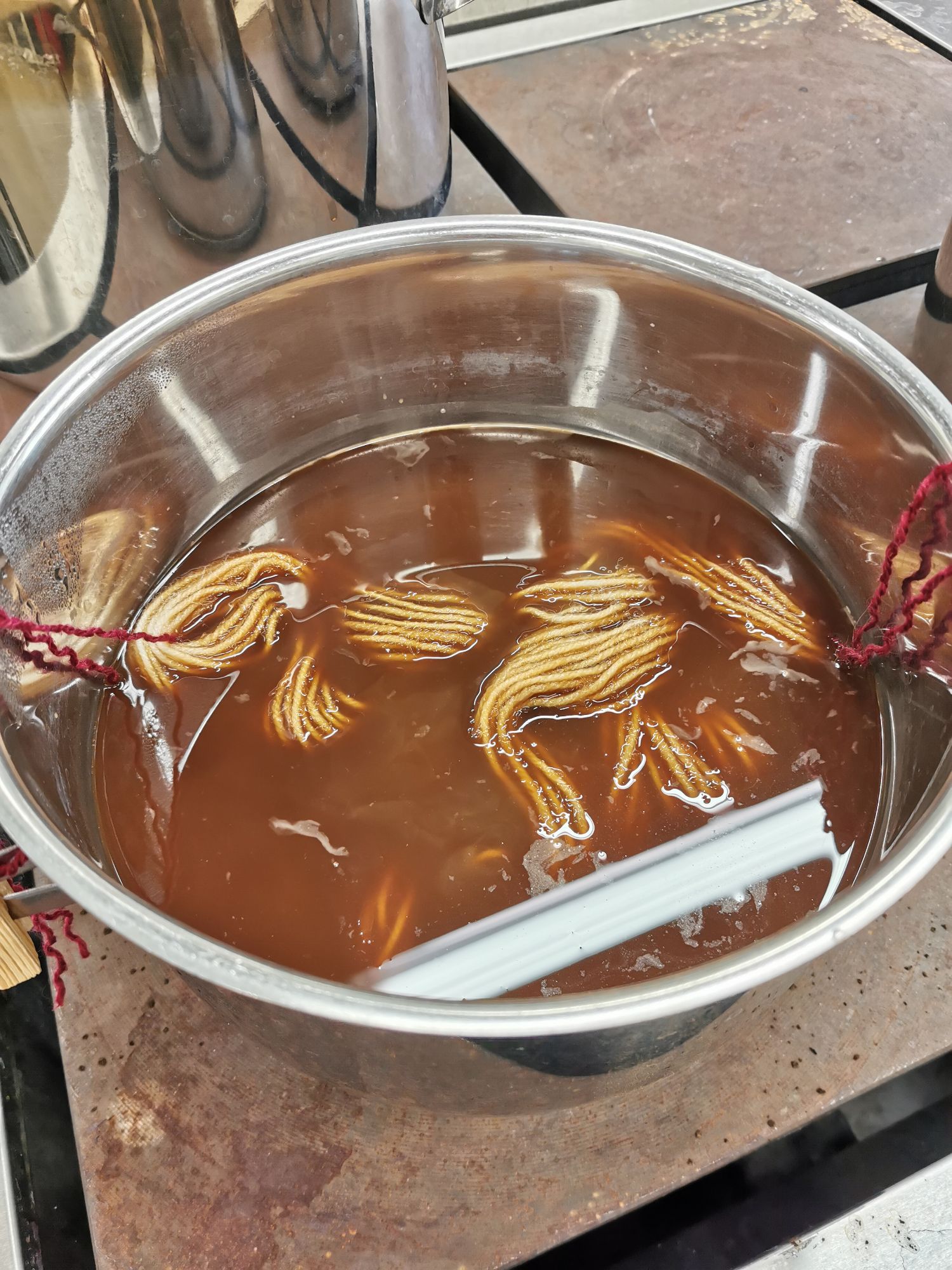 Keitin ensin kahvia n. 2-2,5l vedessä tunnin. Siivilöin purut pois ja lisäsin 50g valkoista puretettua lankaa liemeen. Pidin lientä 80-90 asteessa tunnin ajan. Jätin liemen jäähtymään yön yli. Seuraavana aamuna huuhtelin langan.
