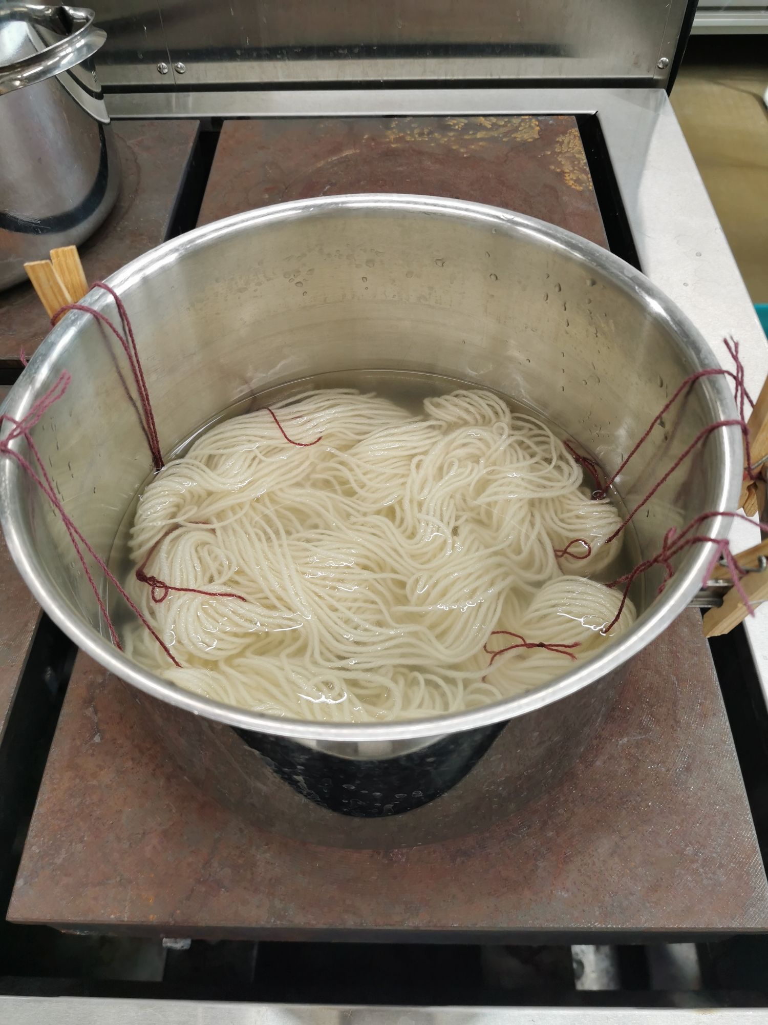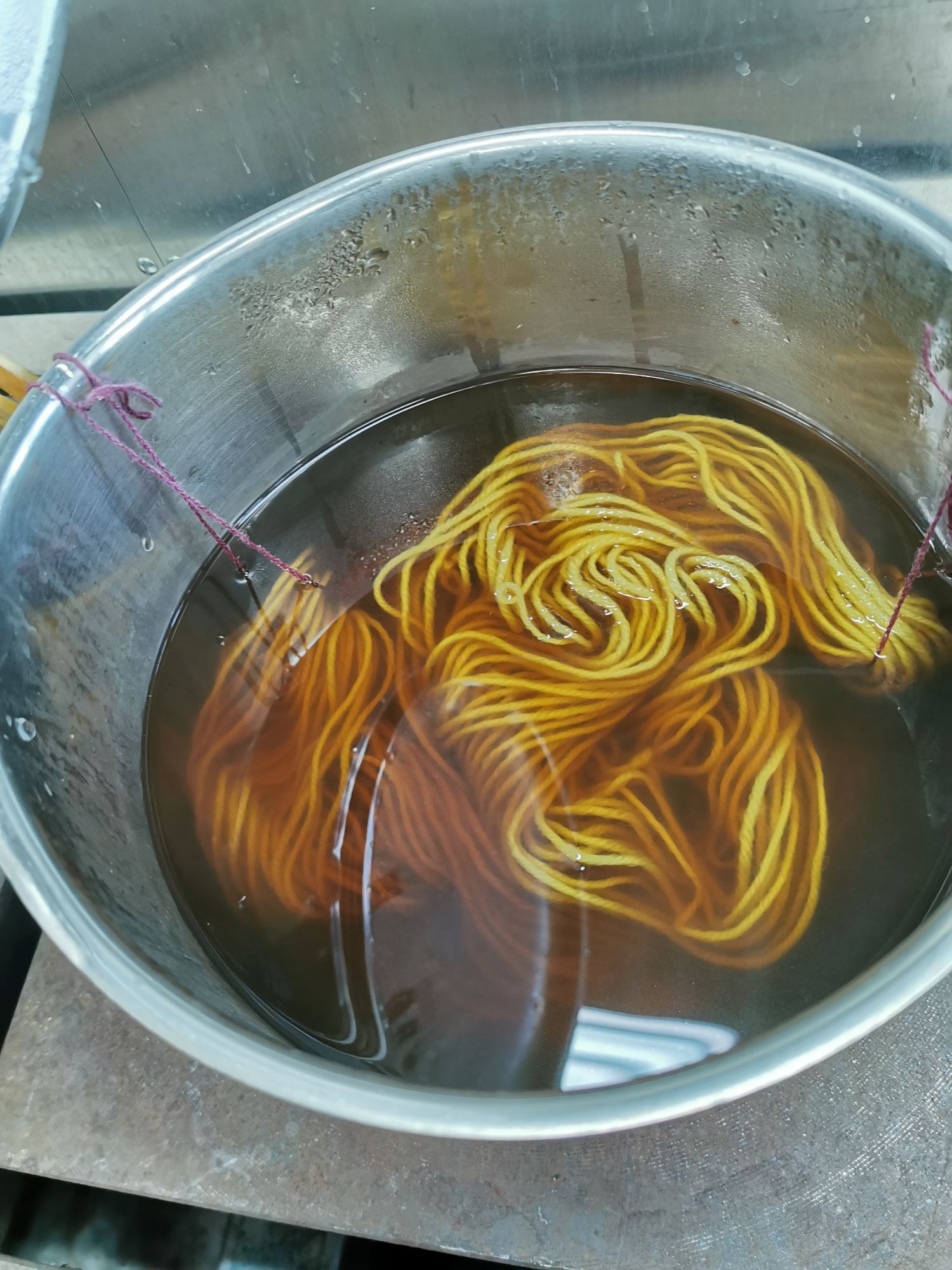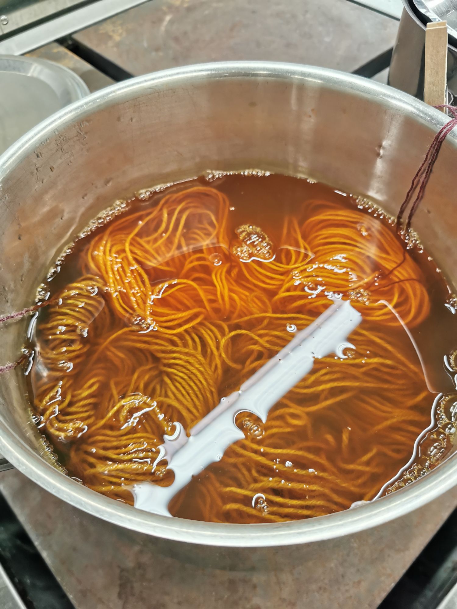 Punnitsin 15g keltasipulin kuoria ja laitoin ne likoamaan 3,5 litraan vettä. Aikansa liottamisen jälkeen keitin vielä niitä tunnin ajan. Tämän jälkeen siivilöin kuoret pois ja lisäsin 100g puretettua lankaa (puolet valkoista ja puolet harmaata). Pidin lientä 80-90 asteessa tunnin ajan, jonka jälkeen jäähdytin ja huuhtelin langat.