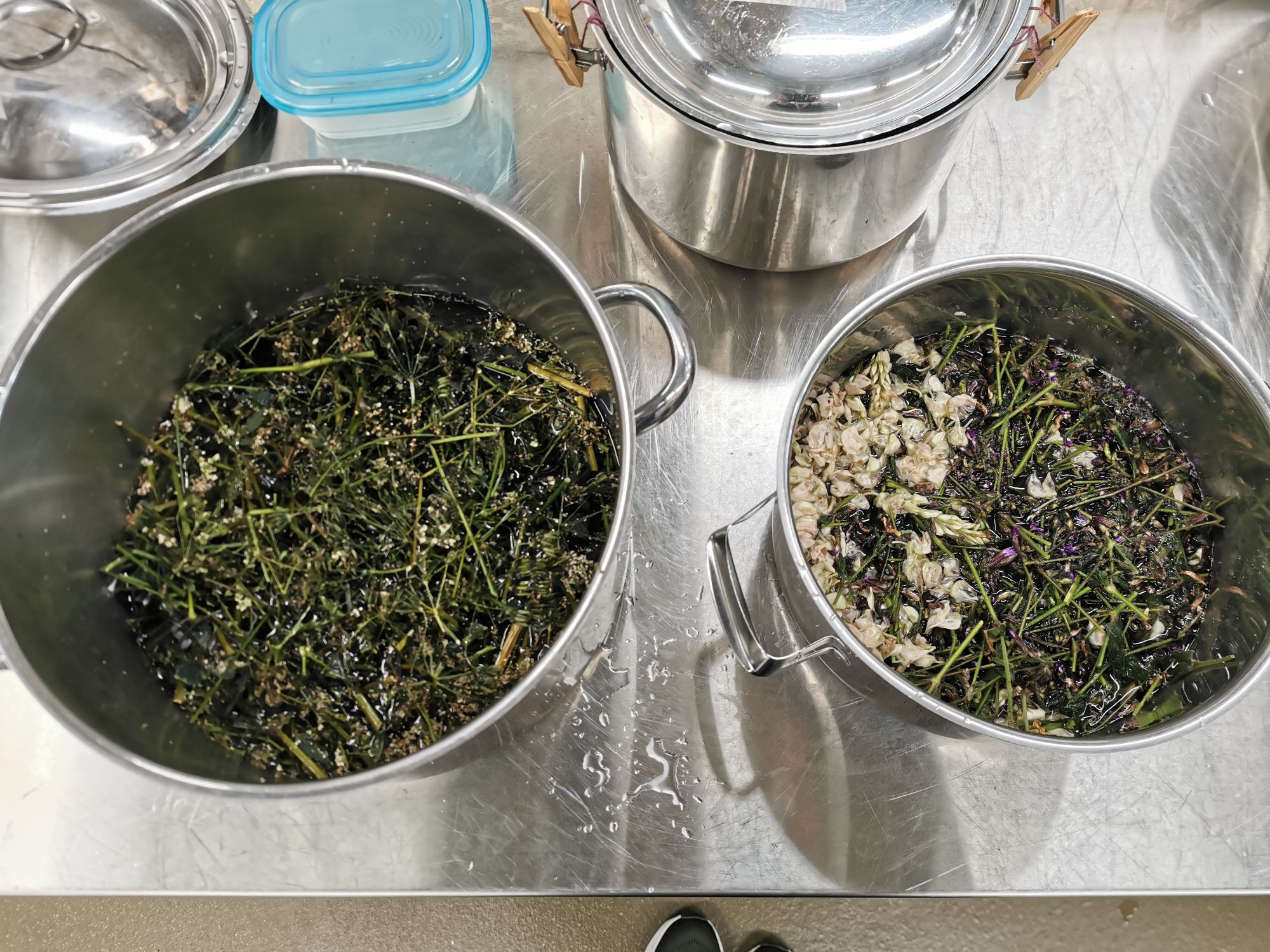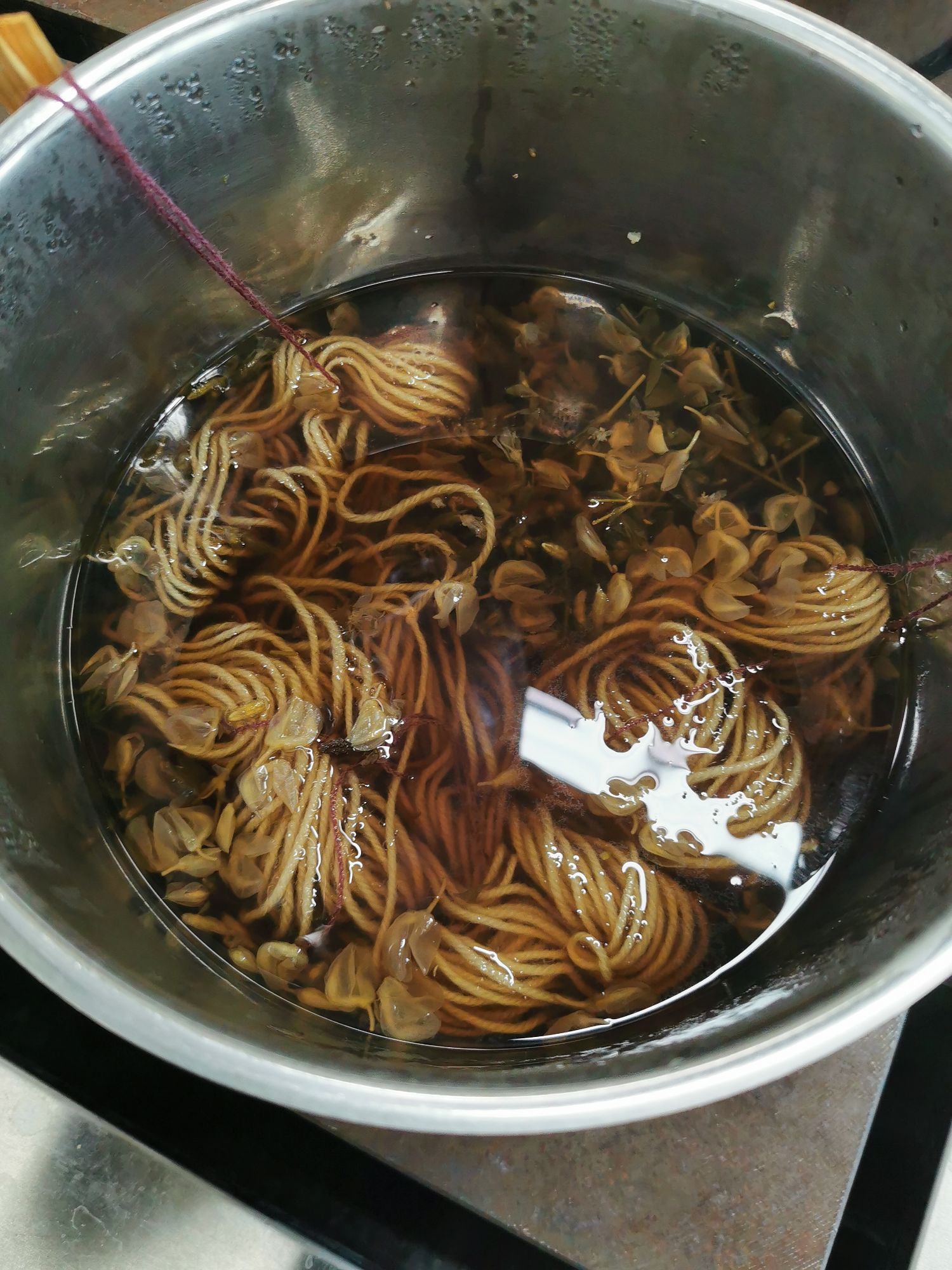 Lisäsin ensin lupiinien sekaan n. 2l vettä ja keitin niitä tunnin. Liemen jäähdyttyä vähän lisäsin langat kattilaan kukkien sekaan ja pidin lientä 80-90 asteessa tunnin ajan. Jätin liemen yön ylitse jäähtymään ja huuhtelin langat seuraavana aamuna.