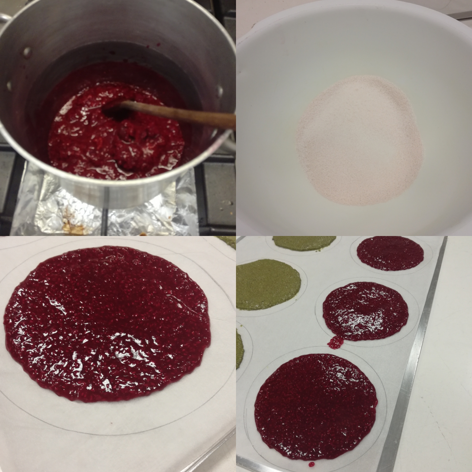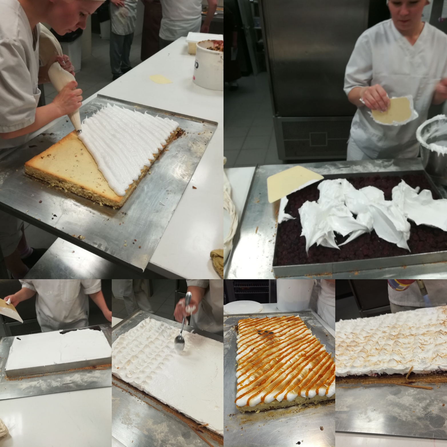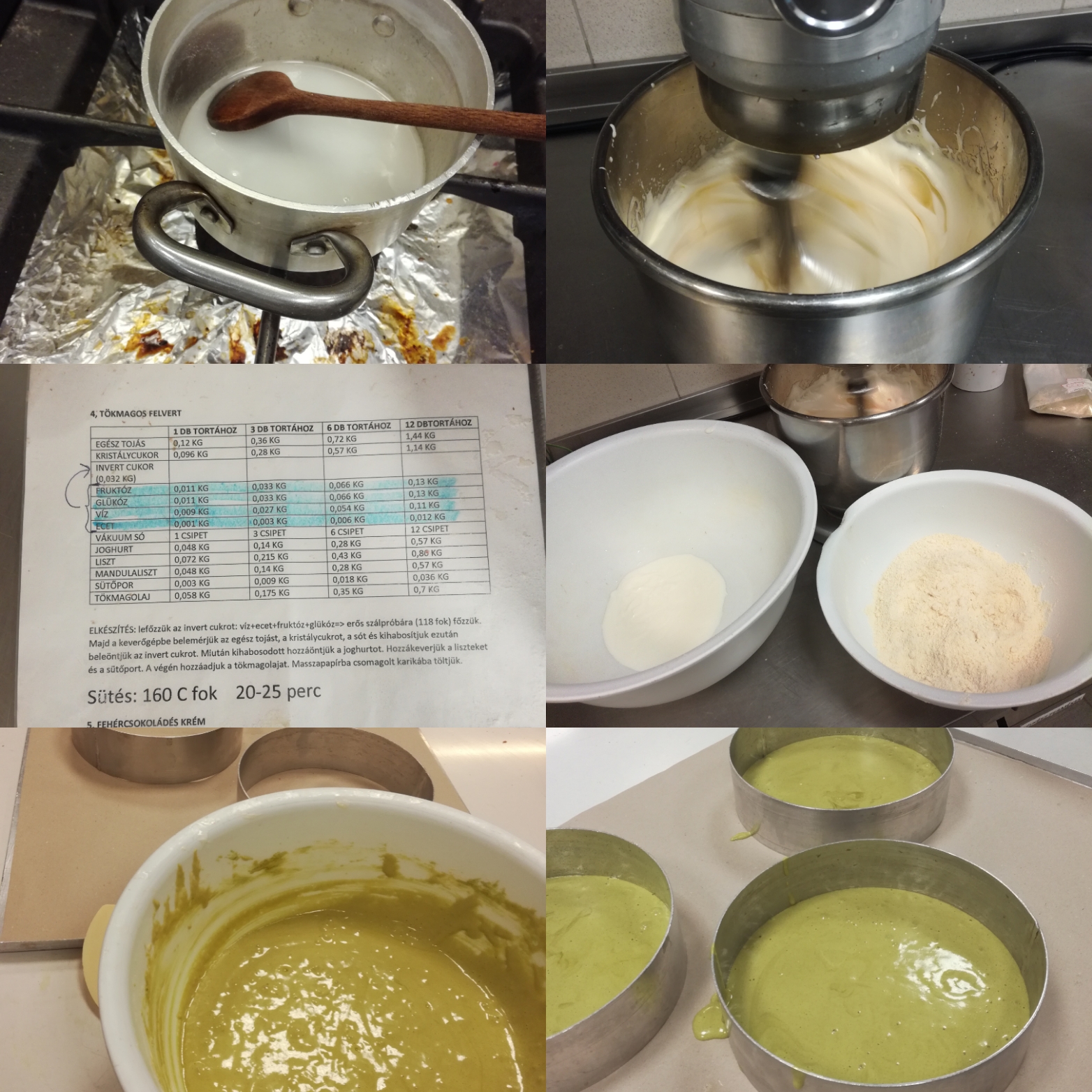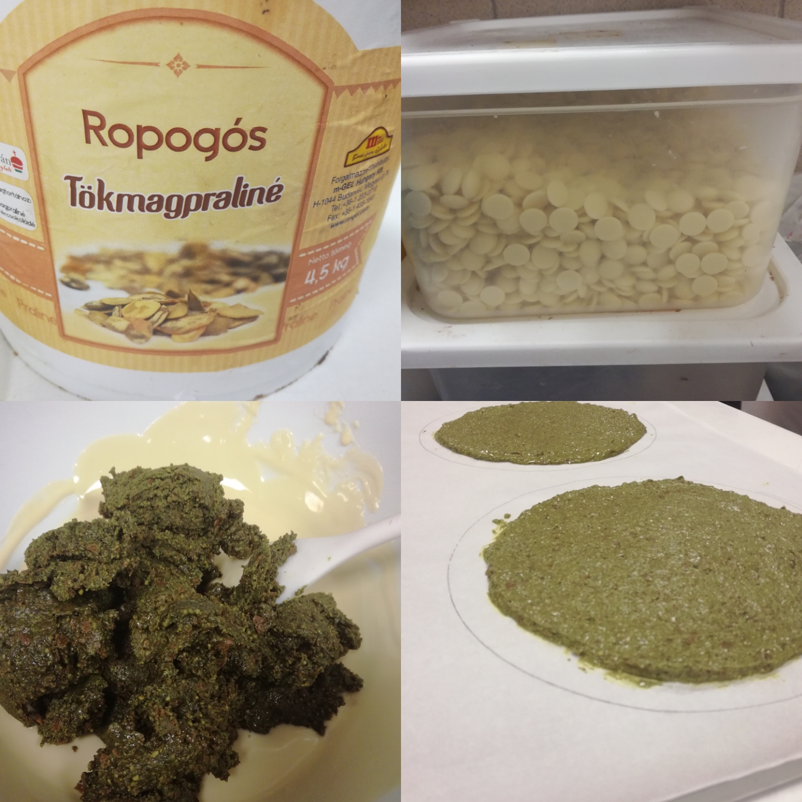 Sitten  sain  valmistaa vihreän kakkupohjamassan..joka on tämän leipomon Unkari päivän spesiaalikakku(siinä esiityy Unkarin lipun värit (vihreä, valkoinen,punainen) Kakkupohjaan tuli kolmea eri ”sokeria” Fruktoosia,Glugoosia ja normi kide sokeria. Kananmunat ja sokeri vatkattiin lapavatkaimella vaahdoksi. Fruktoosi,glugoosi,vesi, etikka kiehautettiin hellalla sitteen kaadettiim kananmunasokeri massaan. Iso kulhoon jugurttia johon massa sitten sekoitettiin ja viimesenä lisätttiin kurpitsansiemenpastaa. Vola vihreä kakkupohjamassa. Se kaadettiin kakkurenkaisiin ja uuniin. Seuraava osuus oli Grispi kurpitsasiemen levy kakkuun. Siihen tuli jo valmista kurpitsansiemenmassaa ja valkosuklaata. Helppoa. Sitten punainen väli johon tarvittiin vadelmia,sokeria,pekstiiniä ja liivatetta. Kummatkin levitettiin leivinpaperin päälle johon oli piirretty kakkurenkaan avulla oikeannkokeoset renkaat. Palettia apuna käyttäen vaan levitettiin ohuset rinkulat pellille, Valmis.. kummatkin pakkaseen jäätymään ja odottamaan kakun kasausta.