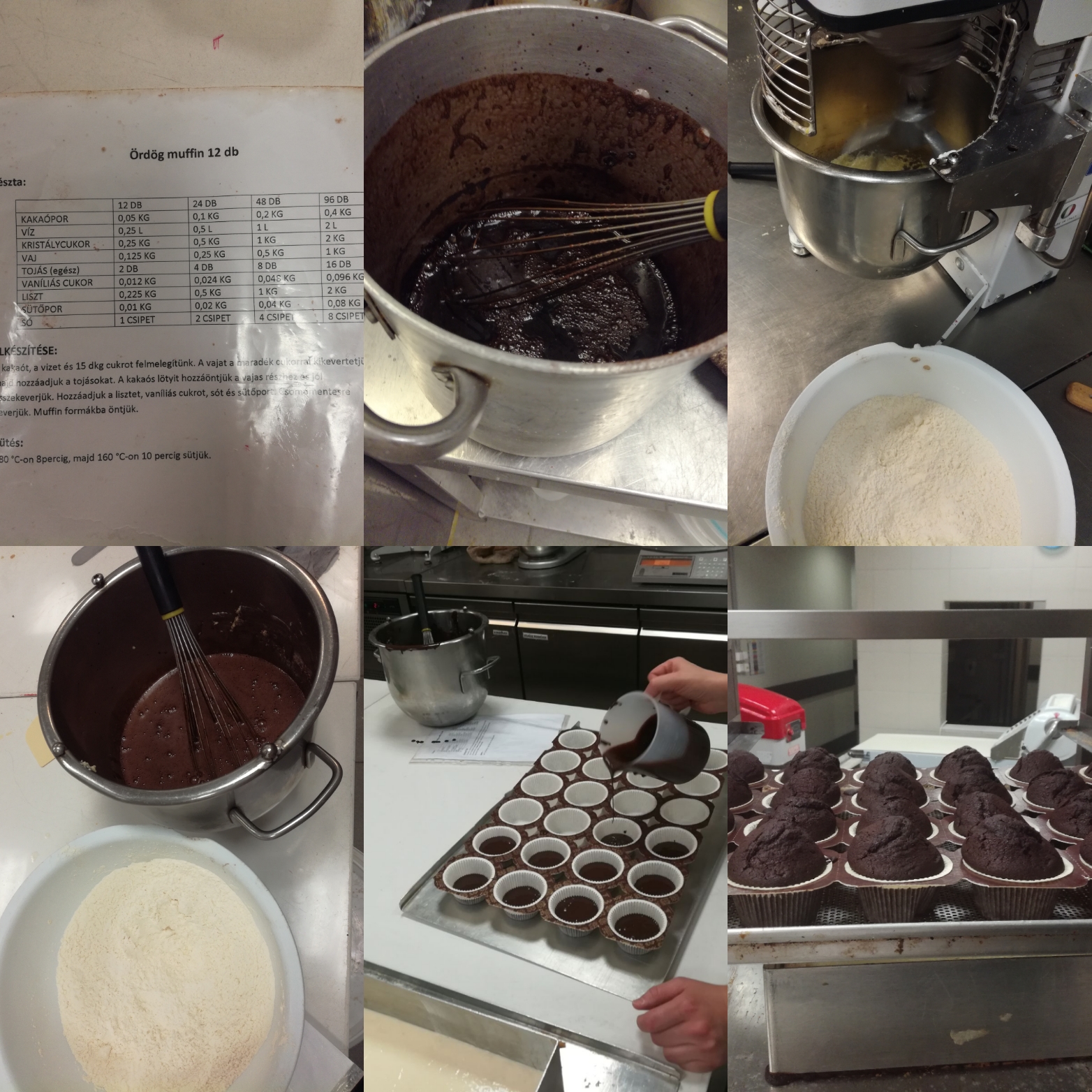 En päässyt kokoamaan Unkarikakkua koska muut komponentit oli vielä tekemättä. Joten siirryin seuraavaan tehtävään joka oli kaakaomuffinsit. Johon keitettiin vesi,kaakao ja tomusokeri. Koneessa vatkattiin voi soketi ja kananmunat. Sinne sit kaadettiin kuuma kaakovesi ja lisättiin jauhot. Muffunsimassa vuokiin ja uuniin. 15min 180°C sit 10min 160°C .