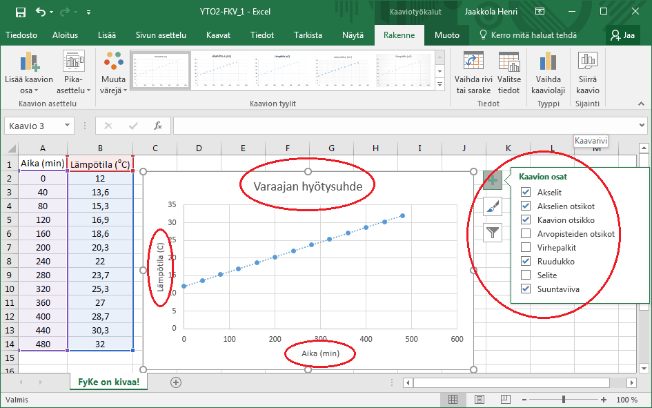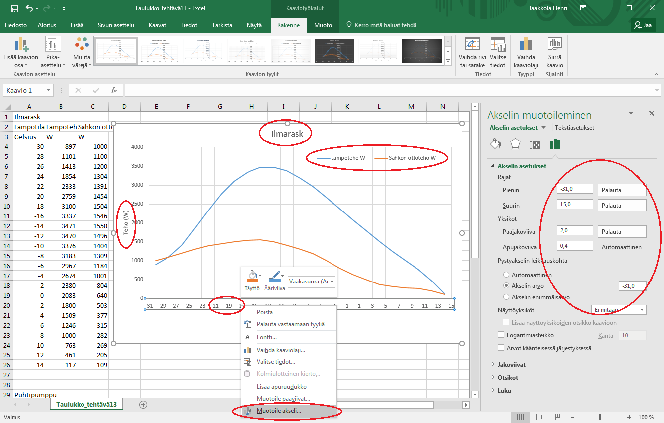 Avaa vanhan fysiikan ylioppilaskoetehtävän taulukkopohja. Tee kuvan mukainen kuvaaja, jonka vaaka-akselin nimenä on ”Ulkoilman lämpötila (C)”. Tallenna tehtävä nimellä FKV_1_3_Sukunimi.xlsx tai parityössä FKV_1_3_Sukunimi_Sukunimi.xlsx.