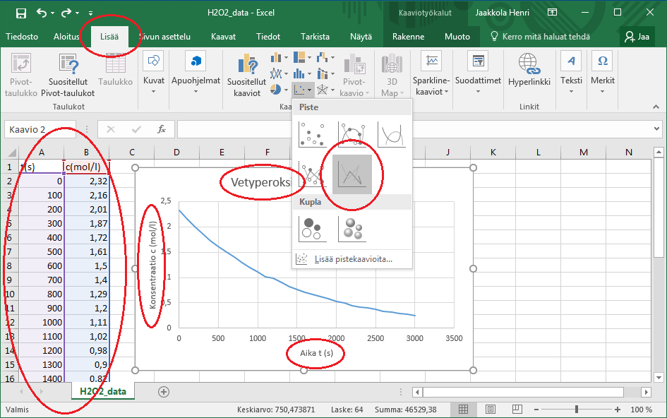 Avaa vanhan kemian ylioppilaskoetehtävän H2O2 data.csv -taulukkopohja. Tee kuvan mukainen kuvaaja, jonka otsikko on ”Vetyperoksidin hajoaminen”. Tallenna tehtävä nimellä FKV_1_2_Sukunimi.xlsx tai parityössä FKV_1_2_Sukunimi_Sukunimi.xlsx.