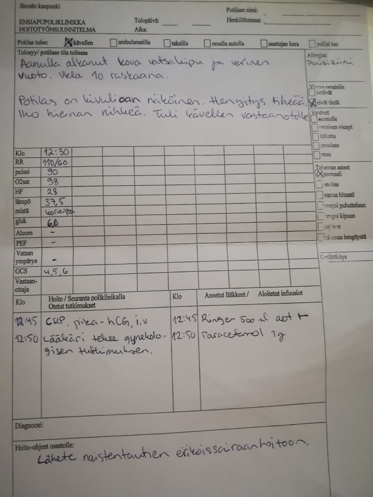 Potilas kertoo, että on aamulla pyörtynyt, vähän sen jälkeen, kun runsas vuoto oli alkanut. Tarkastamme yhdessä myös hänen yhteystiedot ja lähiomaiset.