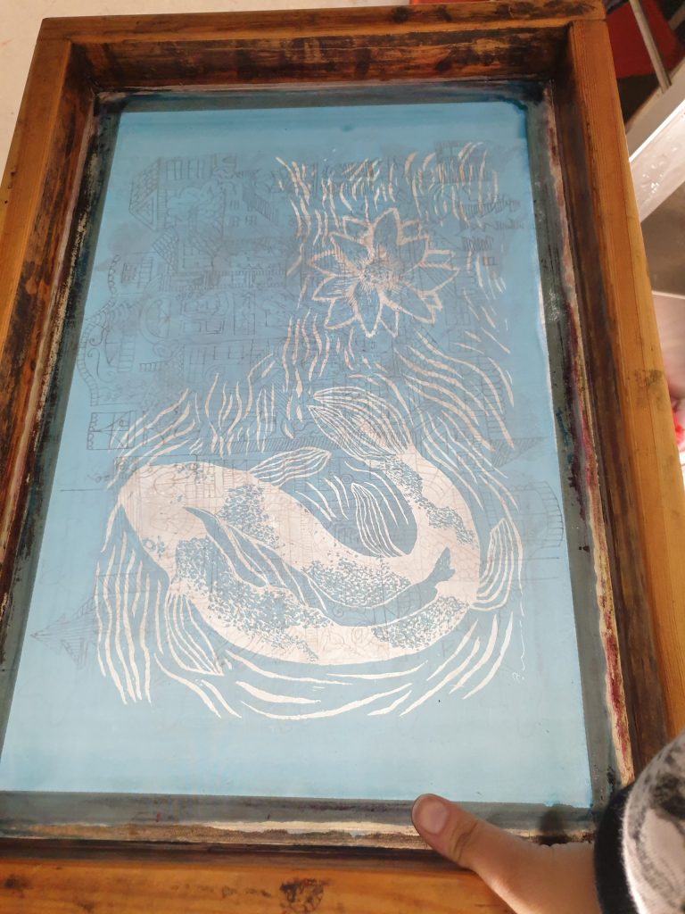 Painoin seulalla monenlaisia kankaita. Alla olevassa kuvassa kuvio on painettu kuultomustalla valkoiselle painopohjalle ja jälkikäteen maalattu värit ruiskuemulsiolla. Miten hauska tekniikka!