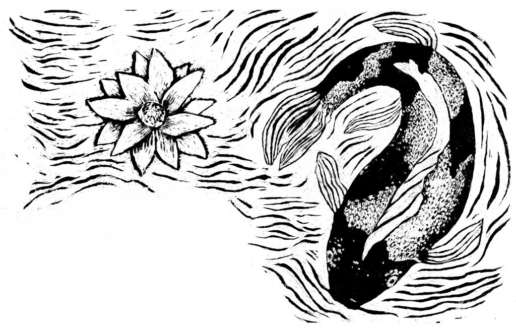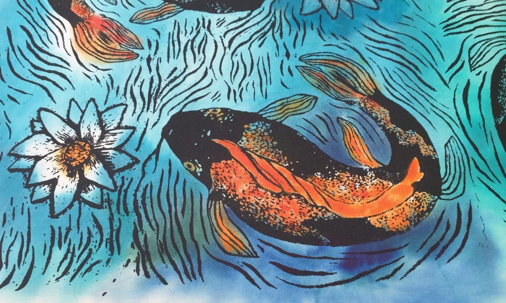 Idea Karppiaiheiseen painokuvioon tuli, kun maalailin vapaapäivänä filmimaalilla pleksille. Olin maalannut kiemurtelevan oksan tai vastaavan muodon ja mies käveli ohi ja tokaisi :”Näyttää ihan monnilta.”