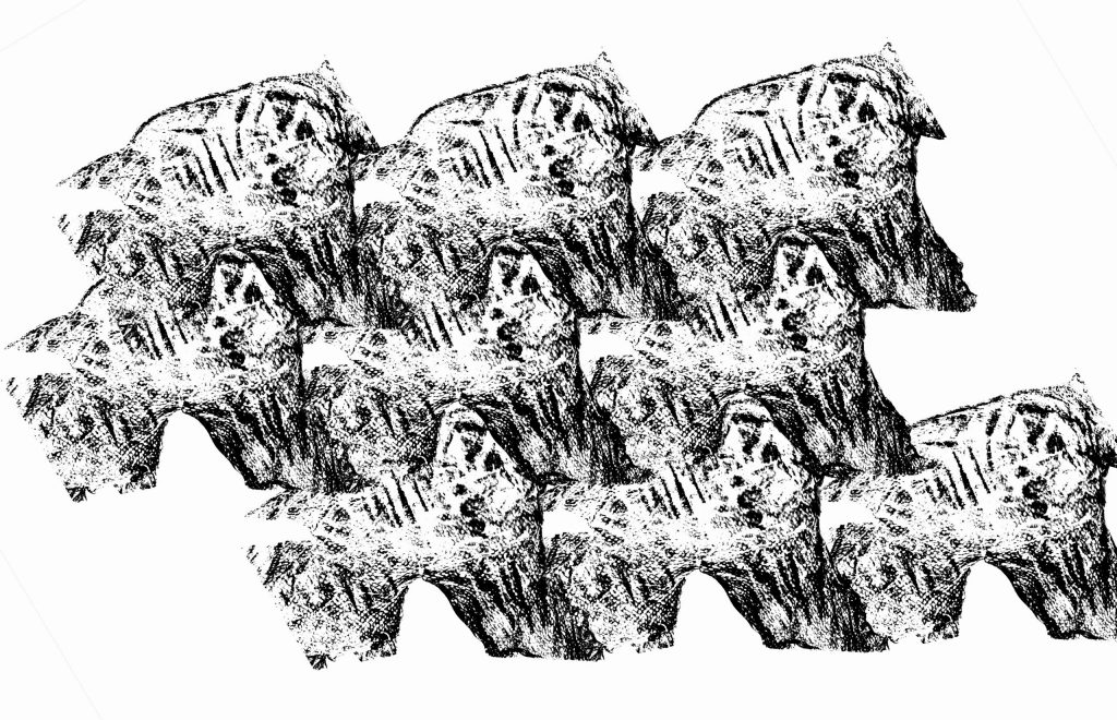 Printti nimeltään Karhukaiset syntyi, kun laitoin palan parkittua mateen nahkaa skanneriin. Muuntamalla kuvan mustavalkoiseksi ja poistamalla harmaan sävyt, sain kuvion sopivaksi valotustekniikkaa varten. Monistin kuvaa kuvankäsittelyohjelmaan ja kokeilin erilaisia sommitelmia. Kuviot näyttivät pieniltä eläinhahmoilta ja siitä nimi. Tästä kankaasta suunnittelin tekeväni pari koristetyynyä olohuoneeseen.