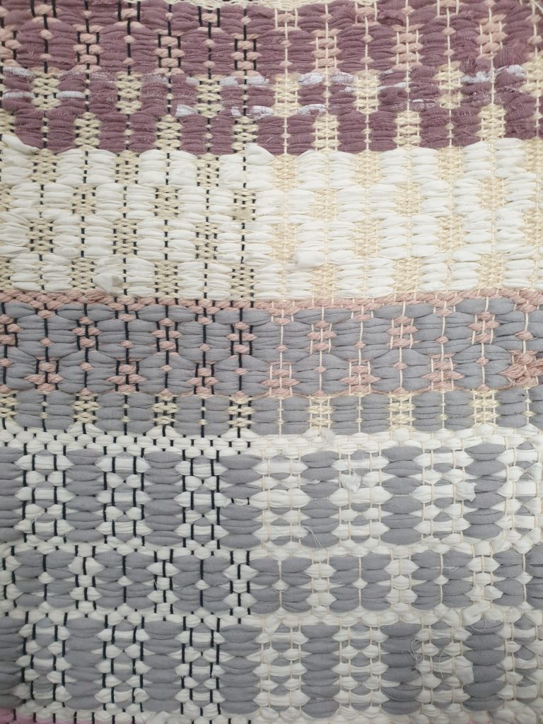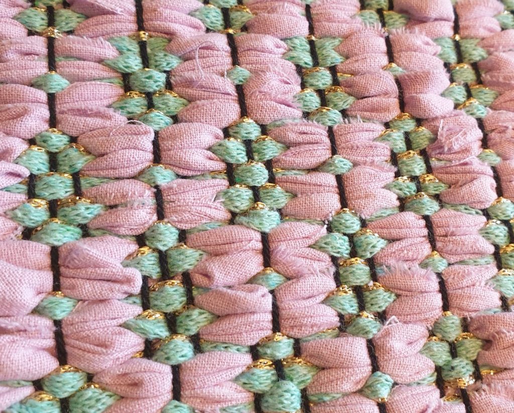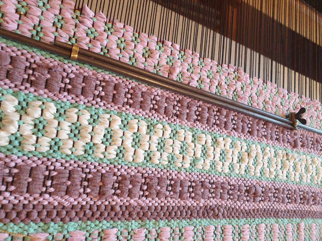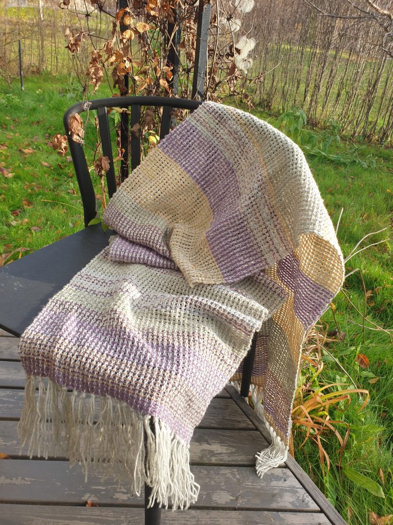 Ryijyn kuvan olen unohtanut laittaa, vaikka se on ollut jo pitkään valmiina. Ryijyyn käytin kasvivärjättyjä lankoja ja merinovillatupsuja. Merinotupsut tekevät ryijyyn utuista tunnelmaa vaikka tässä kuvassa se näyttää lähinnä sottaiselta. Kutoessani ryijyä ajattelin loppukesän maalaismaisemia. Ehkäpä silmiä siristämällä tästä voisi maiseman saadakin.