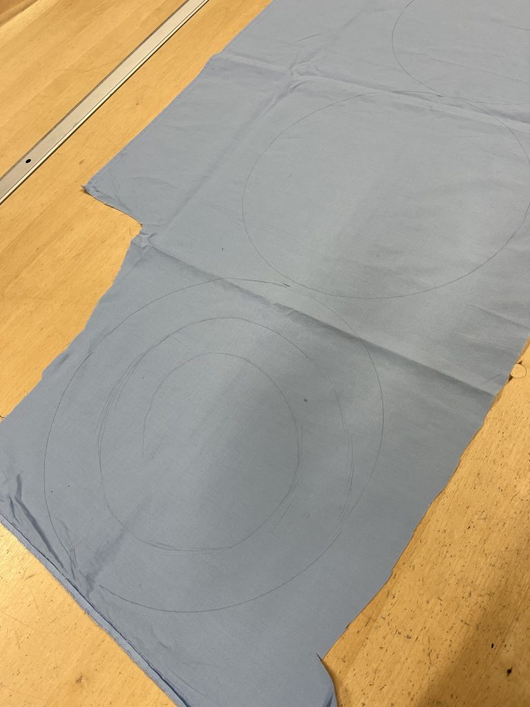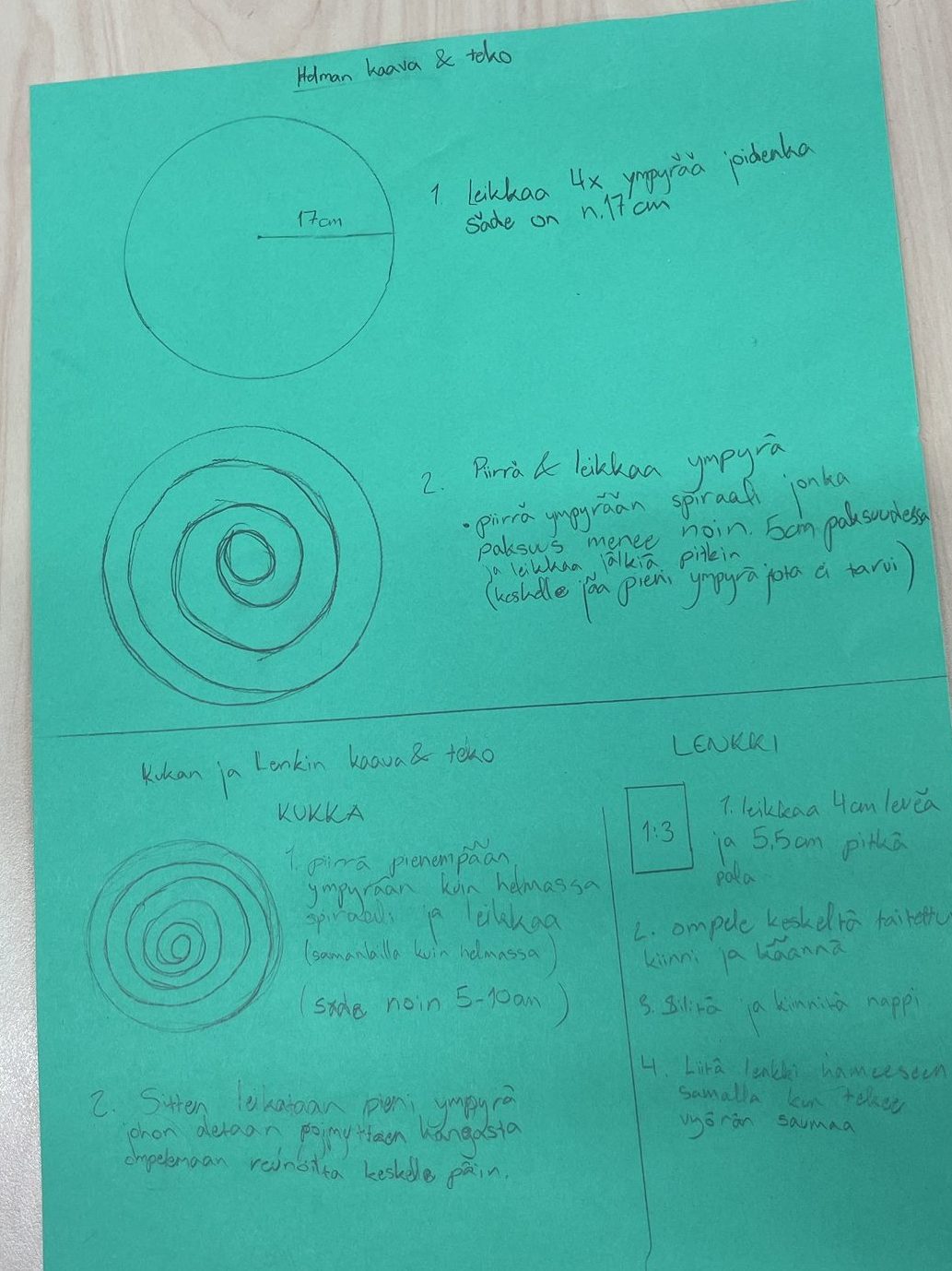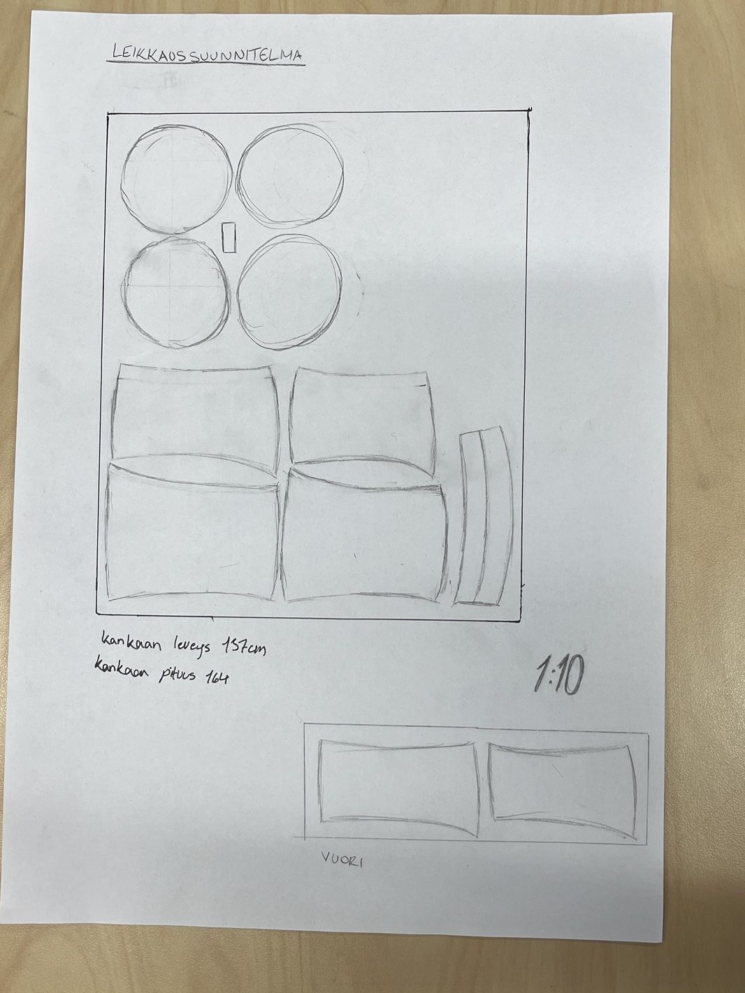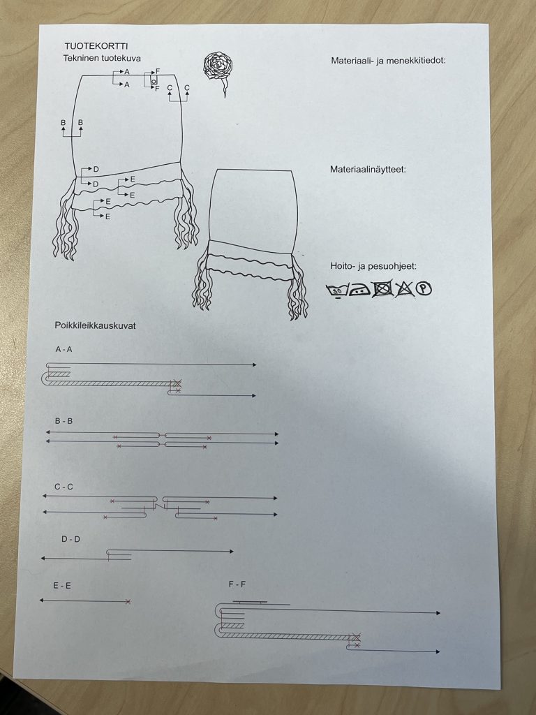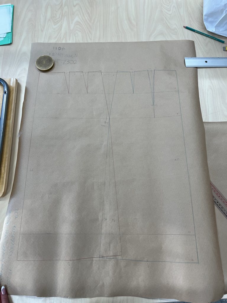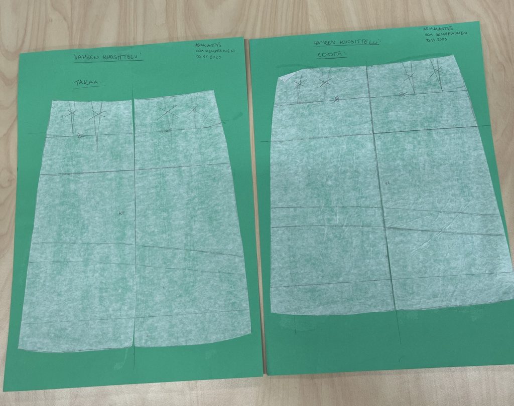 Asiakkaan mitoilla tehtiin aluksi perushameen kuosittelu, josta lähettiin muokkaamaan virallisen hameen kuosittelua. Hameen kuosittelu on piirretty suoraan päälle ja oikeiden mittojen mukaan piirrettiin silkkipaperi kaavat.