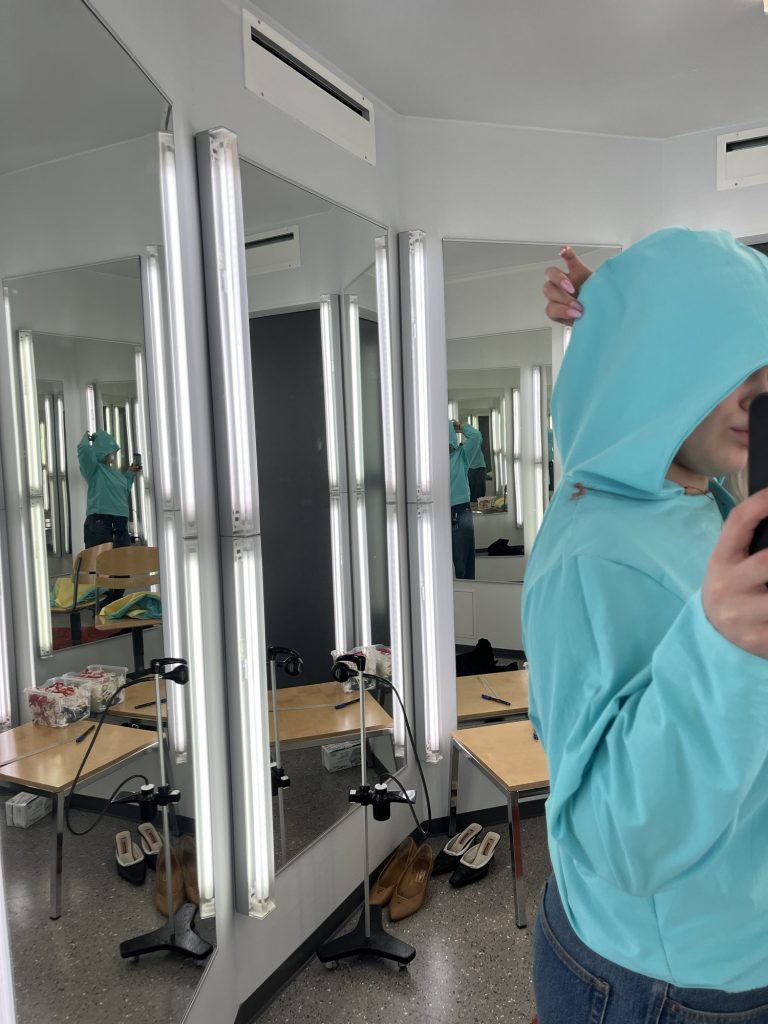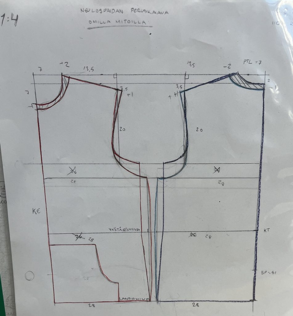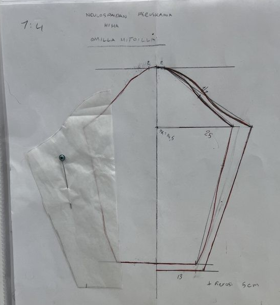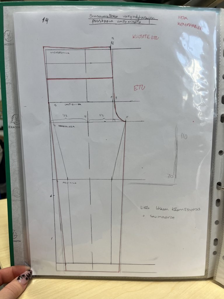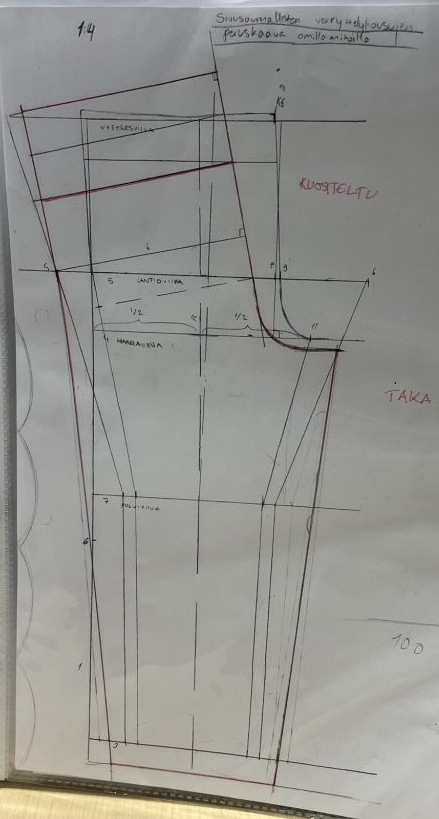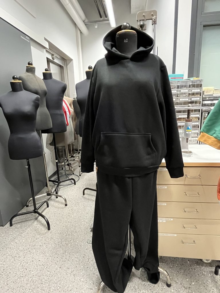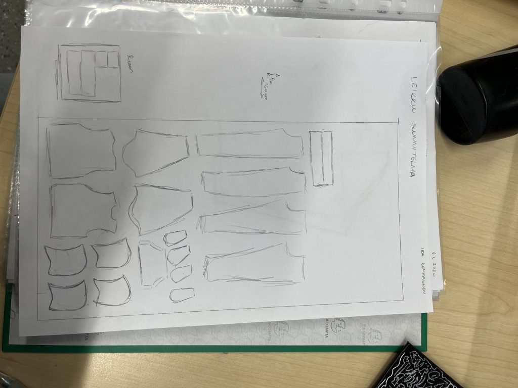 Kun housuista ja hupparista protot olivat hyvin istuvat ja mieleiseni, sitten aloin muokkaamaan yksityiskohtia esimerkiksi huppua