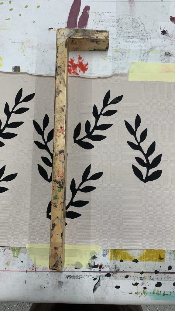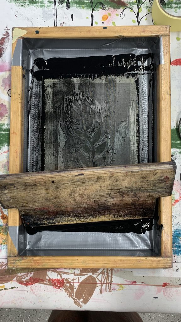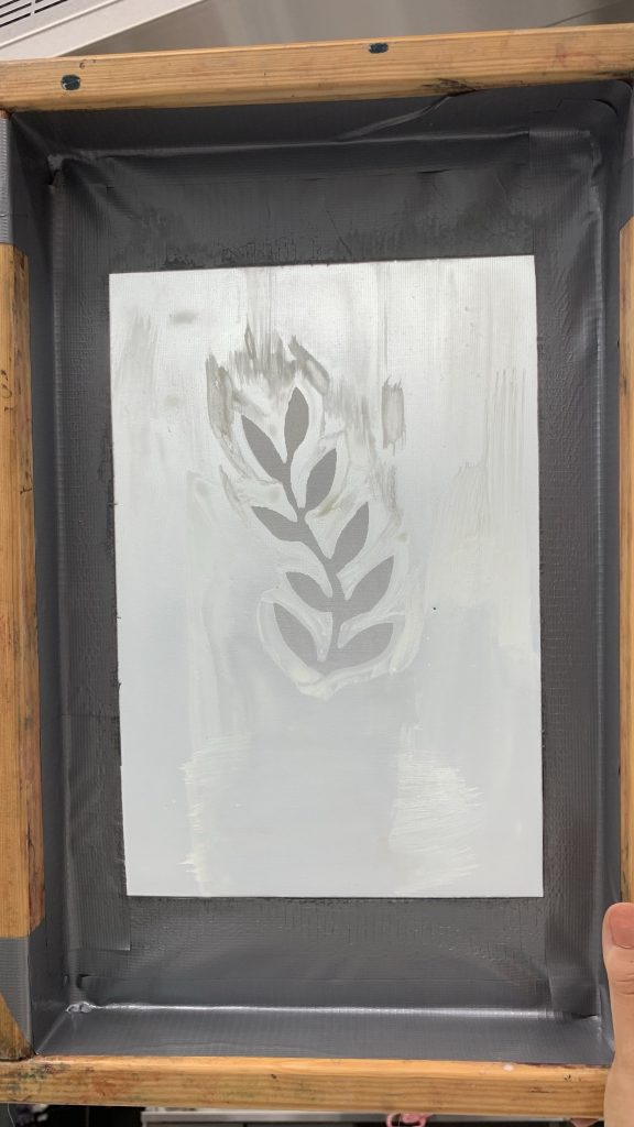 Kudonnan jälkeen pääsimme opettelemaan uutta aihetta; kankaanpainanta. Aloitin ensimmäisen projektin suunnittelemalla painettavaa kuviota seulalle. Halusin kokeilla jotain kasveihin tai kukkiin liittyvää teemaa, joten lähdin hahmottelemaan paperille muutamia eri vaihtoehtoja. Kun ensimmäinen luonnos oli valmis, siirryttiin tekemään seulaa. .Seulalle levitettiin sulaa vahaa, joka esti värin tarttumisen seulan läpi kankaaseen. Halutut kohdat jätettiin vahaamatta. Vaikka idea kuulosti ja näytti opettajan tekemänä kovinkin helpolta, ei se sitä ollutkaan. Vasta kolmannella kerralla sain oman kuvani onnistumaan.