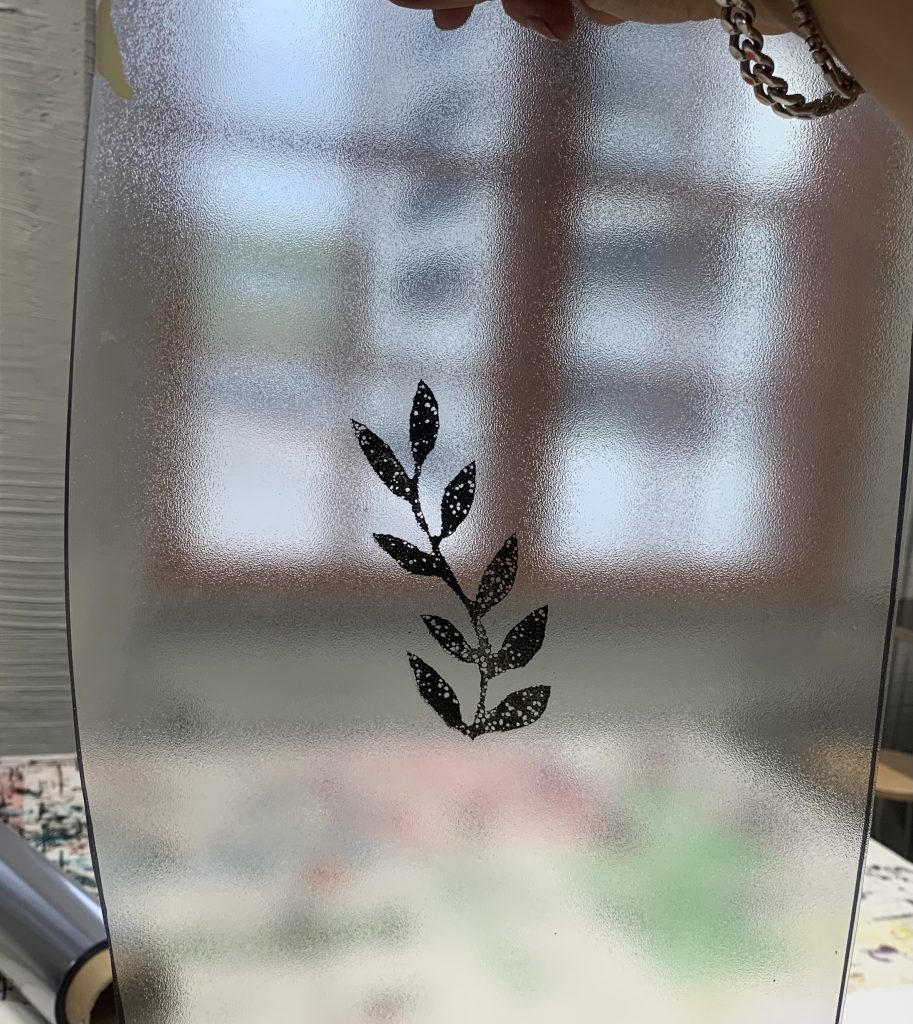 Kun seula oli valmis, painoimme kuvan kohdistuskalvolle. Se helpottaa kuvan sommittelua kankaalle sotkematta sitä. Tämän jälkeen päästiinkin jo itse asiaan! Painamisosio olikin helppoa ja kivaa. Asetettiin seula kohdalleen, pyyhkäistiin väriä edestakaisin raakelilla ja nostettiin seula pois. Sen jälkeen painoväri täytyi kiinnittää lämmön avulla, ja siihen käytin hiustenkuivaajaa.