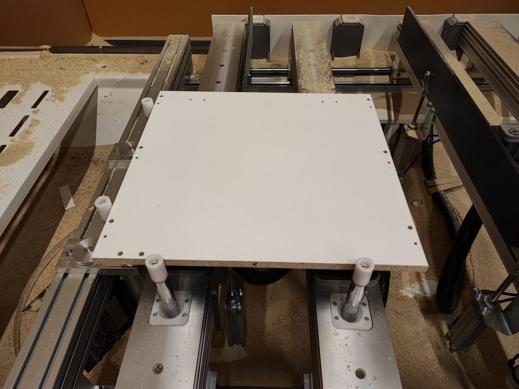 Nauhoituksen jälkeen oli vuorossa yläkaapin sivujen poraustyöstö CNC-koneella. Omana haasteena oli reikien paikkojen määrittely mutta pienellä avustuksella sekin onnistui. Ennen kappaleen laittamista koneeseen, on kuitenkin huolehdittava imukuppien oikeasta sijainnista, ettei pora osuisi niihin. Tässä CNC-koneessa oli se erilaista verrattuna koulun koneeseen, että imukuppien paikkaa ei tarvinnut määritellä erikseen. Kun kappale oli paikoillaan niin itse työstö oli nopeaa.
