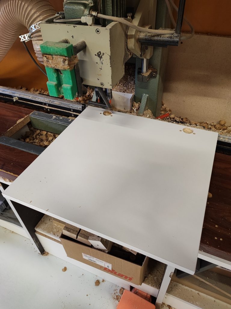 Seuraavana tehtävänä oli kaapin ovien saranaporaus. Ovi sijoitettiin paikoilleen ja polkimesta painamalla kone teki työnsä. Ovet tehtiin kristallimelamiinilevystä ja muut osat tavallisesta melamiinista.