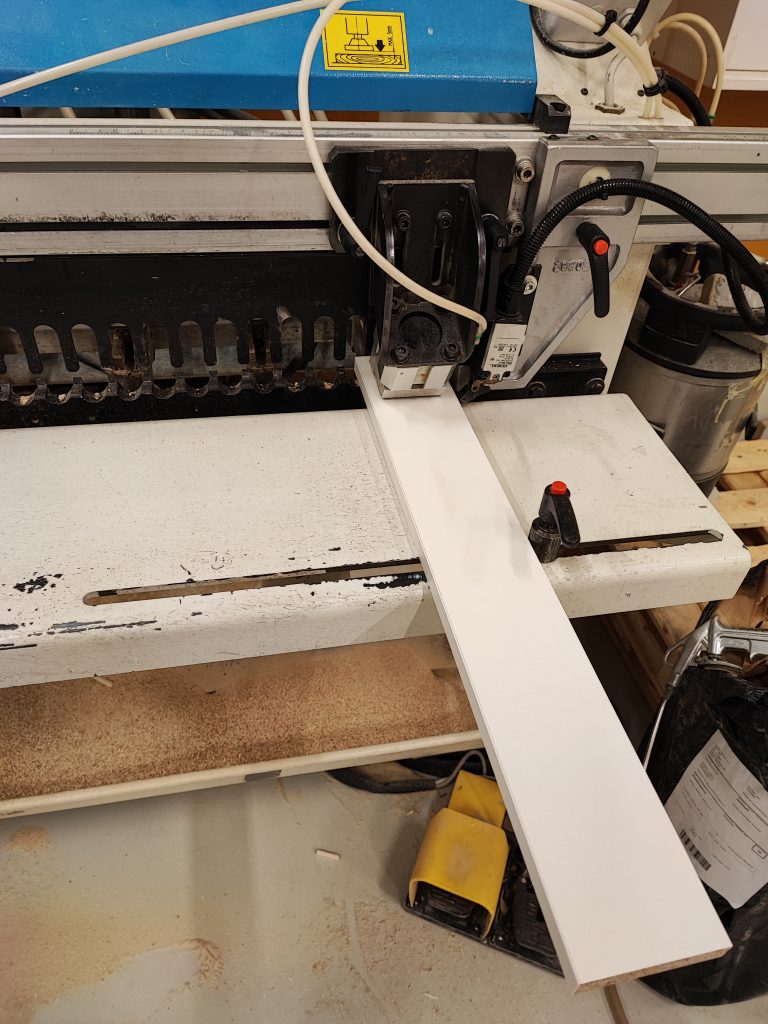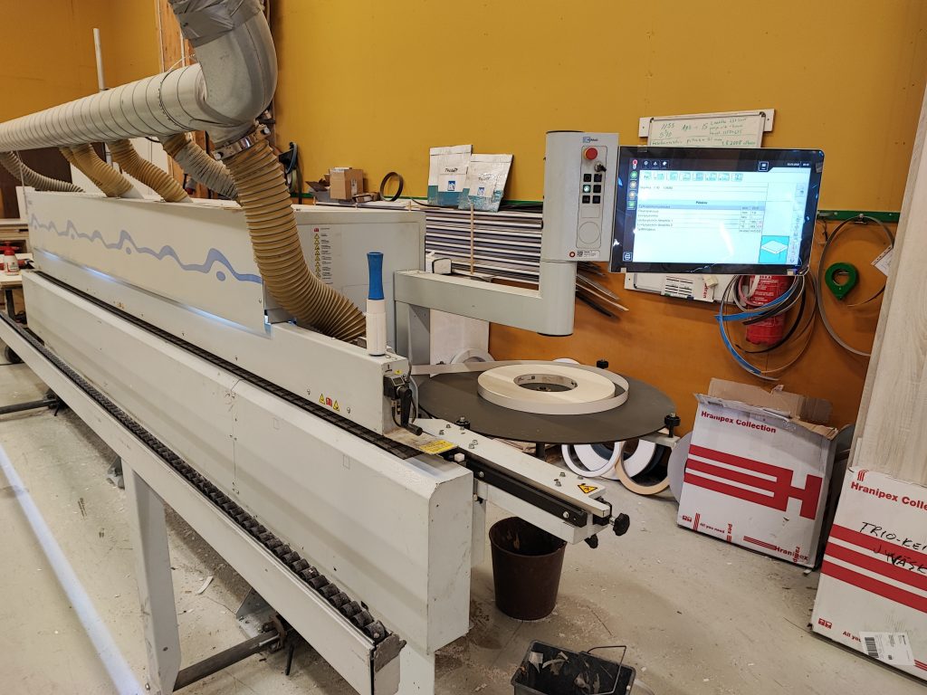 Seuraavaksi oli vuorossa kaikkien osien reunojen nauhoitus kuvassa näkyvällä nauhoituskoneella. Tämän koneen käytössä on tärkeää huolehtia koneiston siisteydestä, jotta jälki olisi hyvä. Ennen työstöä on hyvä huomioida myös liiman lisäys.