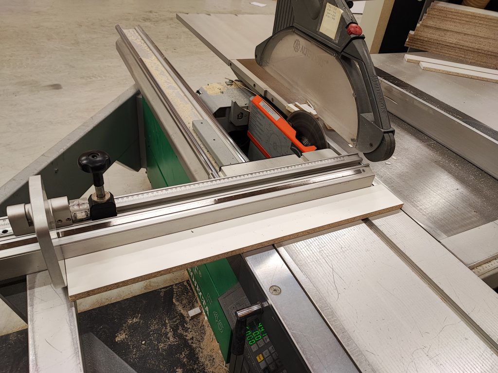 Ensimmäisenä tehtävänä oli tehdä sirkkelillä kaapin osat. Tässä kuvassa sidelistan sahausta.