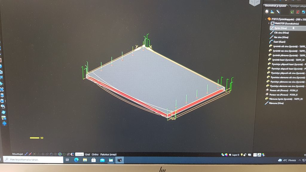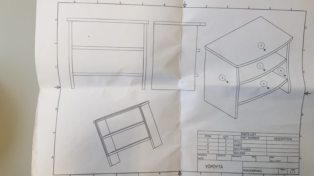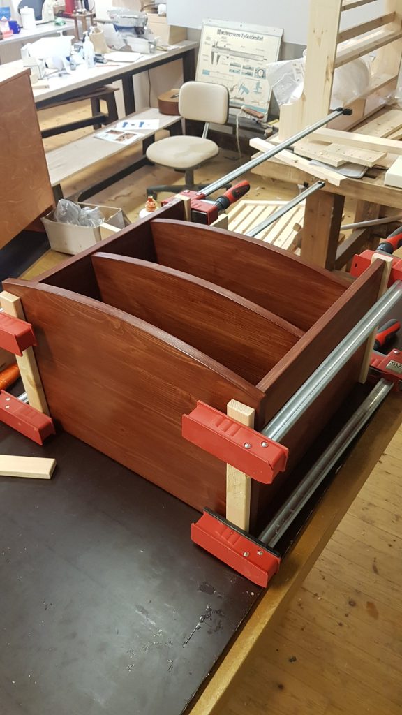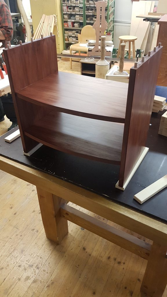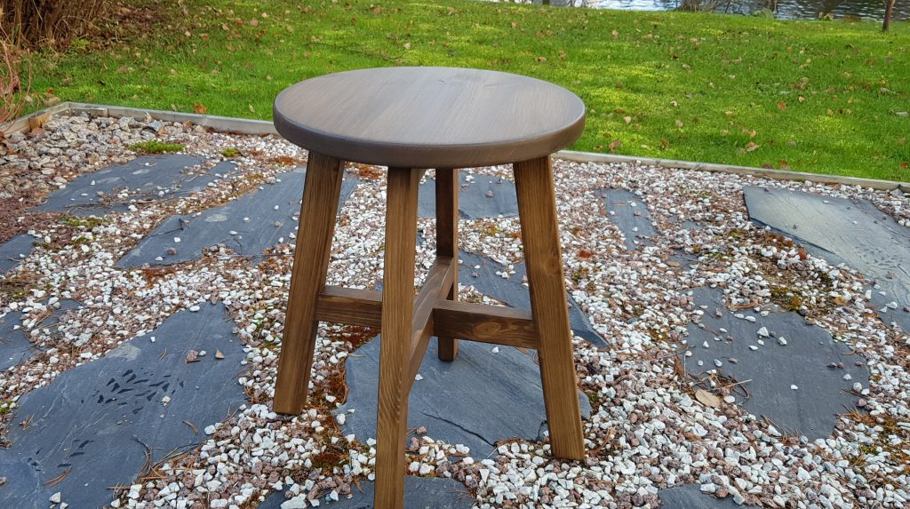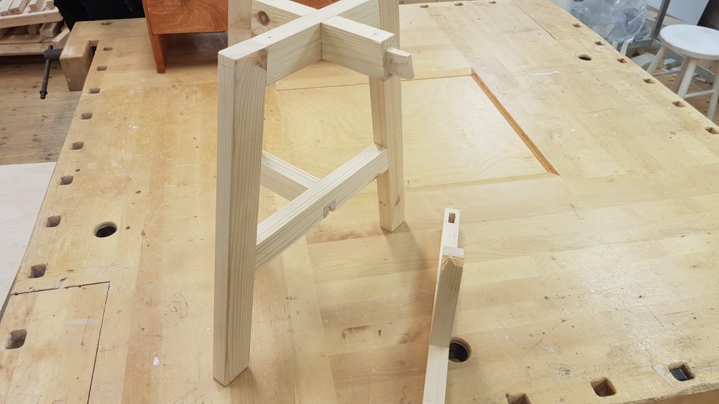 Toisena varsinaisena työna teimme jakkaran. Yöpöytään verrattuna se valmistui nopeammin koska koneet olivat tutumpia ja opiskelijat eivät olleet yhtäaikaa samoilla koneilla. Mutta tämän valmistus vaati enemmän tarkkuutta mittojen kanssa. Työssä tuli hieman takapakkia opettajan pudotettua vaningossa liimauksessa olleen jakkaran jalat lattialle. Uusien jalkojen valmistuksessa ei kuitenkaan mennyt kuin päivä. Liitostapana käytettiin tasotappiliitosta jiirikulmalla