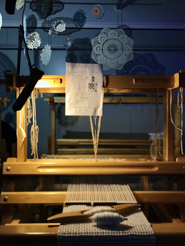 Tässä suunnittelin valonkaupunkia varten teoksen yhtä osaa. Valmistin kangaspuilla muovista ja kankaasta pitkää pötköä, joka tulee muiden pötköjen sekaan. Tämä projekti oli luokan yhteinen, jossa jokainen teki osansa.