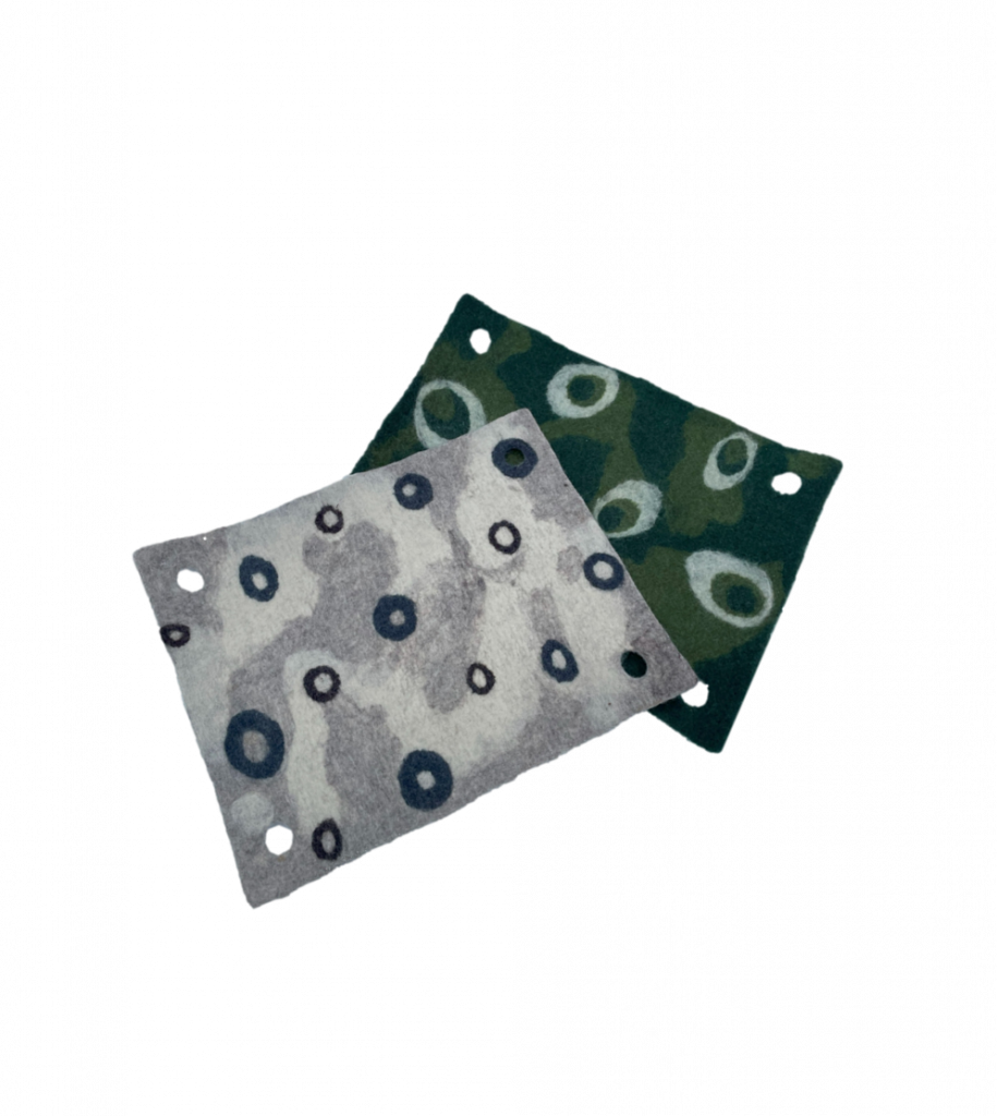 Suunnittelin retkeilyyn villaistuinalustat. Suorakaiteen muotoiset istuinalustat, joiden kaikissa neljässä reunoissa on pyöreät reiät, joista alustat voi laittaa naulakkoon roikkumaan tai retkellä puun oksista kuivumaan/tuulettumaan.