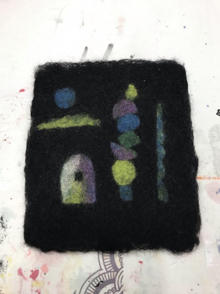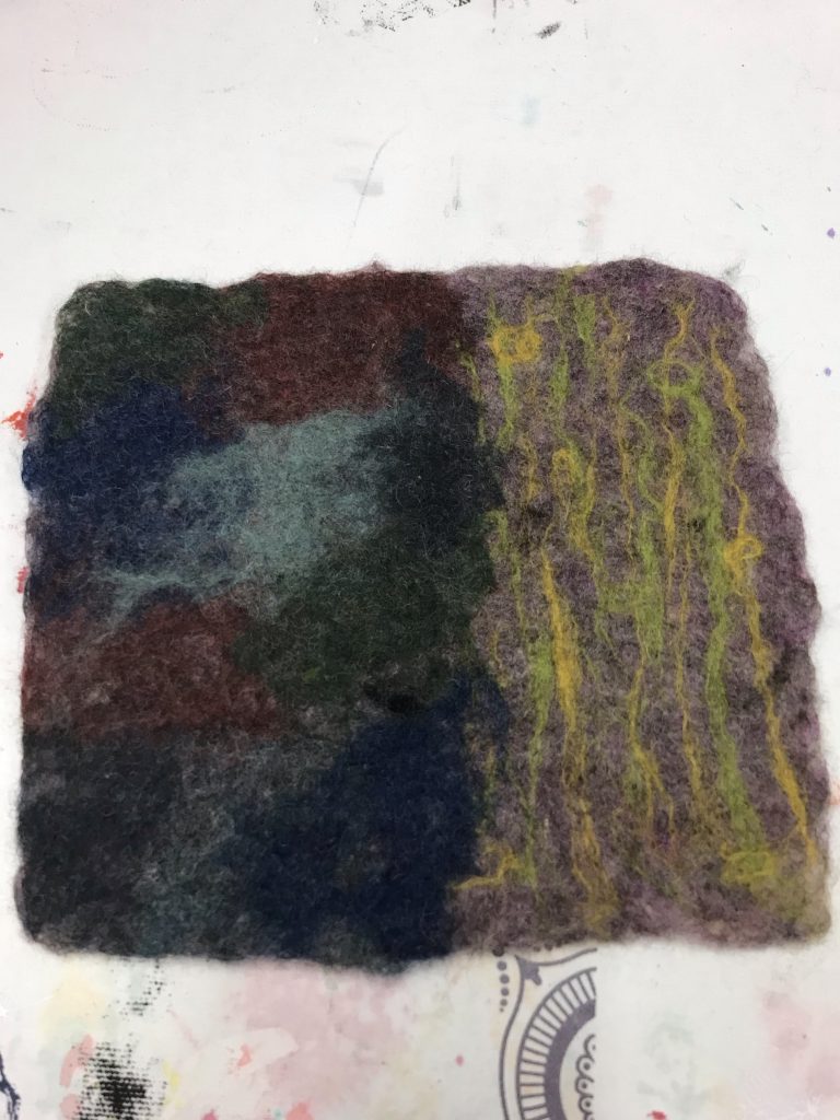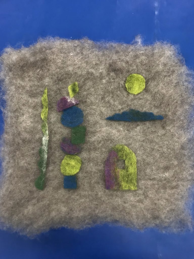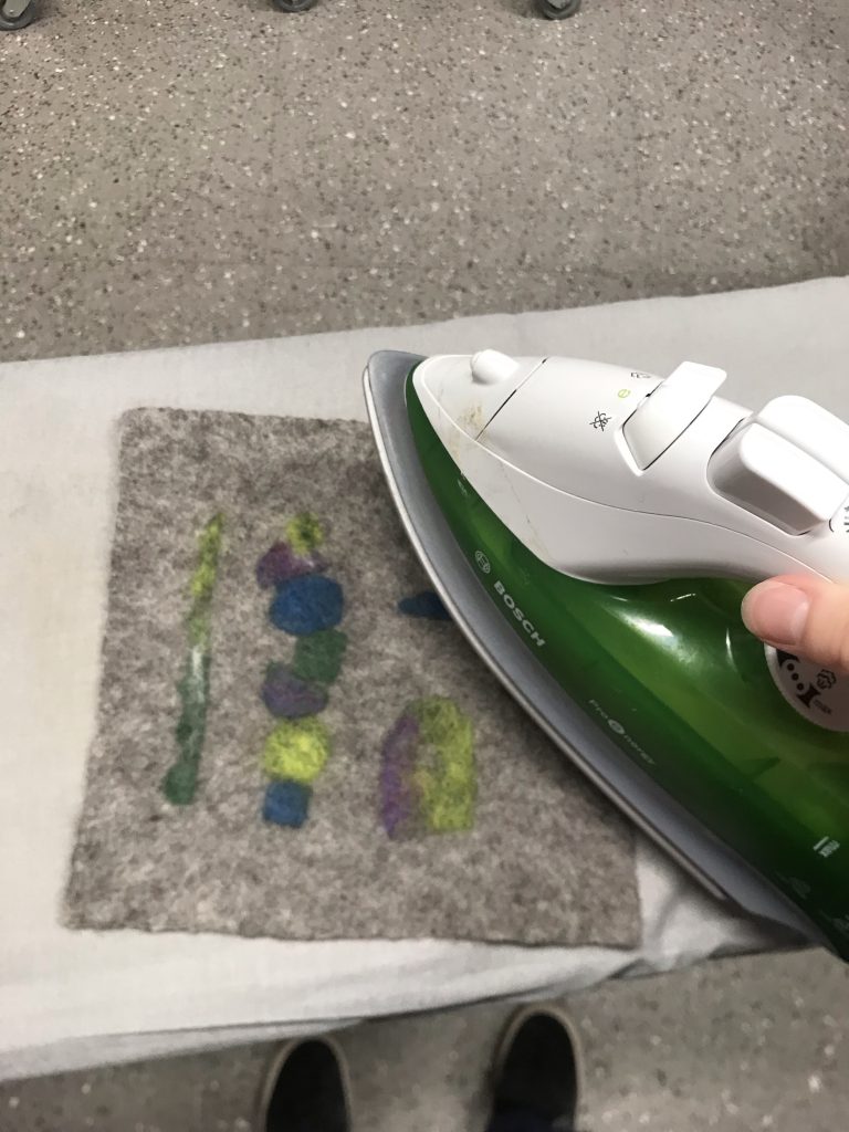 Tässä ”päiväkoti-tilkku”, joka oli ensimmäinen ja helpoin huovutus tapa. Kuvio tehdään kuivalla villalla kuivalle pohjalle.