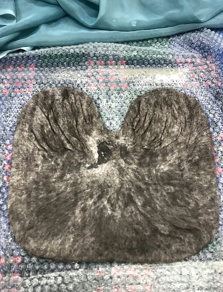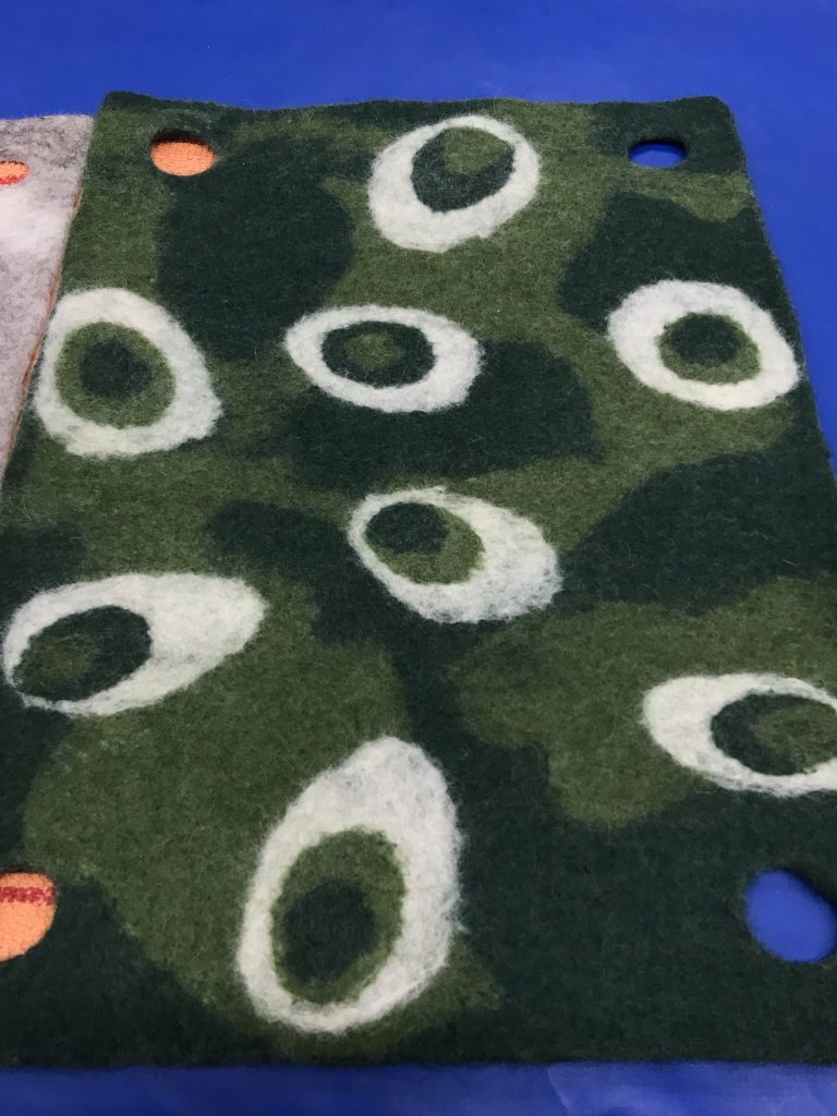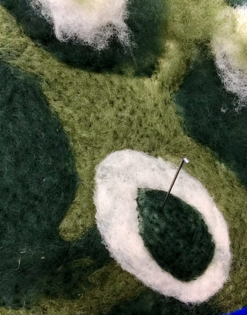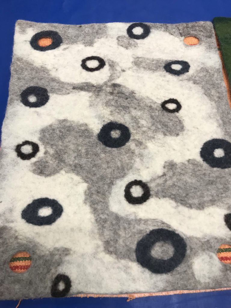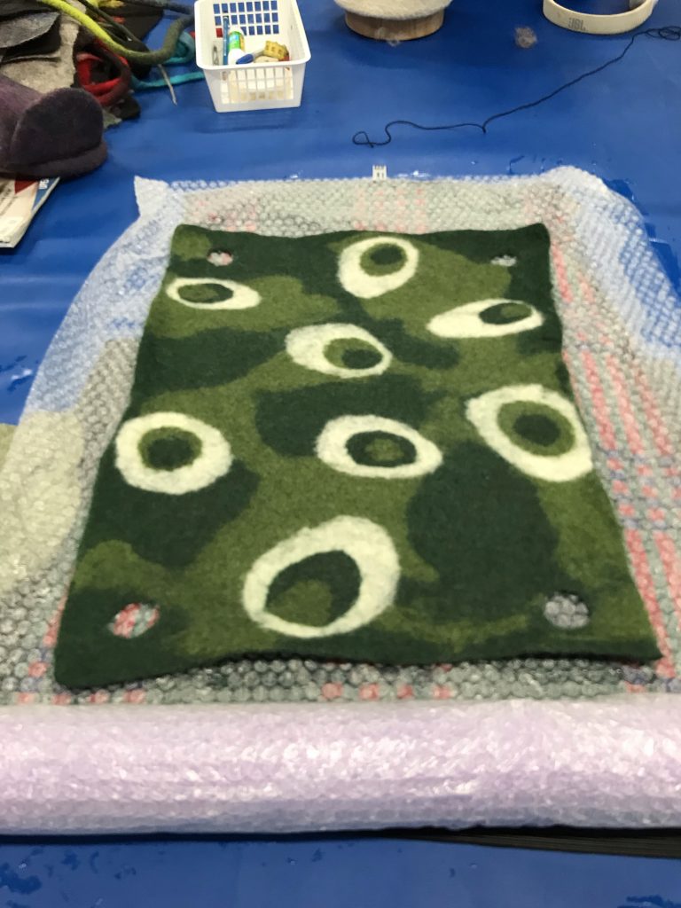 Villojen välissä on valkoinen esihuopa ”jääkarhu”, jonka päälle huovutin kuvioita neulalla. Neulan jälkeen siirryin rullaamisen pariin. Pyyhe työn alla, joka imee ylimääräiset vedet. Pyyhkeen päällä kuplamuovia, jonka päällä työ ja työn päällä harso. Kuplamuovi ja harso estää työn tarttumasta pötkylään, jolla rullataan. Tasaisin välein levitin työn päälle lämmintä vettä ja saippuaa, jotta villa huopuu kauttaaltaan tasaisesti.
