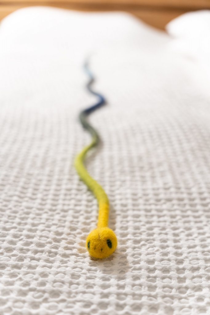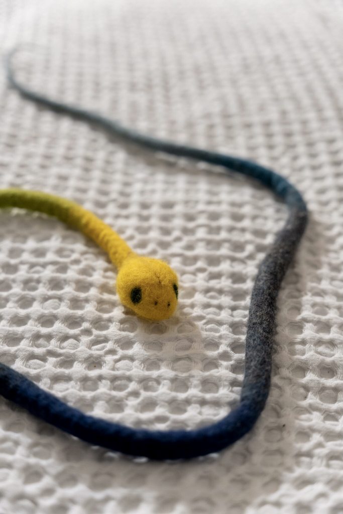 Suunnittelin pikkuveljelleni joululahjaksi käärmeen. Käärmeestä halusin tehdä pitkän, joten siitä tuli reilu metrin mittainen. Käärme valmistui rullaamalla ja käytin eri värisiä villoja, jotta sain tehtyä liukuvärjätyn näköisen käärmeen. Käärmeen pään sisällä on villainen ”pallo”, jonka päälle huovutin ensin neulahuovuttamalla villaa tasaisesti ympärille. Jatkoin huovuttamalla käsillä pyörittäen ja käytin apuna lämmintä vettä sekä saippuaa. Huovutin neulalla käärmeelle silmät ja sieraimet.