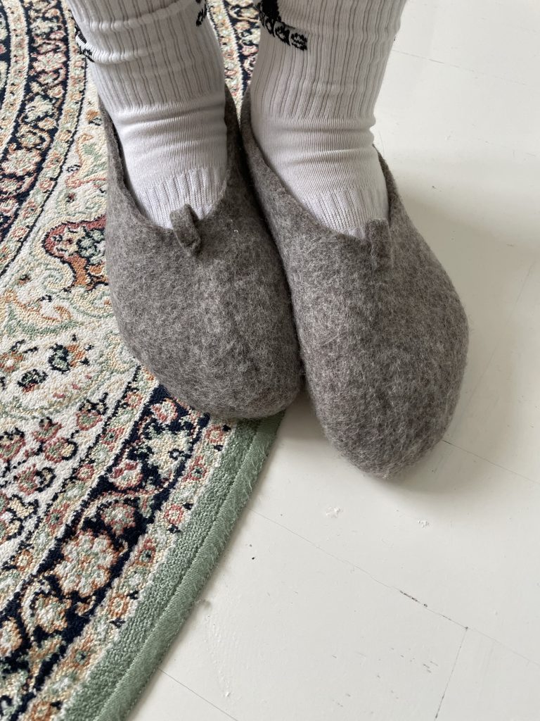 Muotoilin tossut suoraan omaan jalkaan sopivaksi. Tossuista tein matalavartiset ja lisäksi ompelin tossujen etuosaan lenksut. Lopputulos oli onnistunut, mutta olisi näin jälkeenpäin tehnyt mieli tehdä pitempi vartiset tossut, joissa on käännetyt reunat.