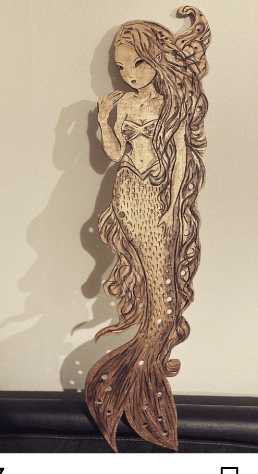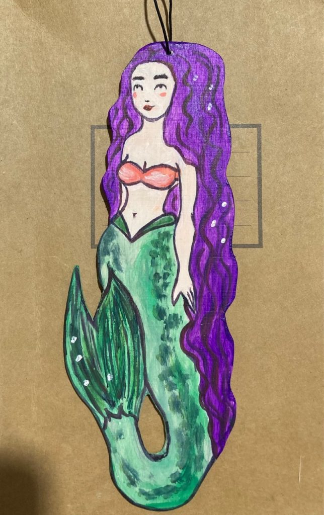Merenneito-koriste vanerista. Akryylimaalaus. Testasin osaan näistä eri tyyppisistä koristeista mustien rajojen tekemistä tussilla, koska ääriviivoja oli melko vaikeata tehdä, mutta se ei ollut hyvä ratkaisu. Kuvassa molempien ääriviivat on maalattu akryyliväreillä.