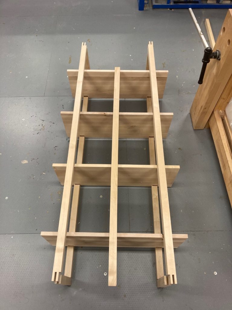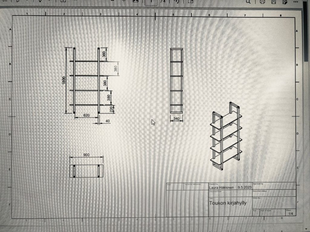 Yksi näyttötöistäni oli pieni ja siro kirjahylly koivusta. Kuvassa on se on vielä alkuperäisen kirjatukikeppi-ideansa kanssa, josta kuitenkin luovuin myöhemmin, koska neliskanttinen pora ei ylettynyt hyllylevyn keskelle. Pintakäsittelin työn Woodio-puusaippualla.