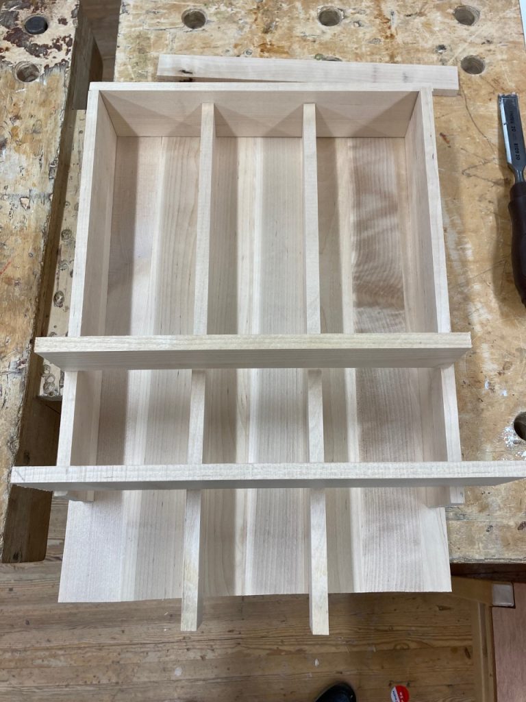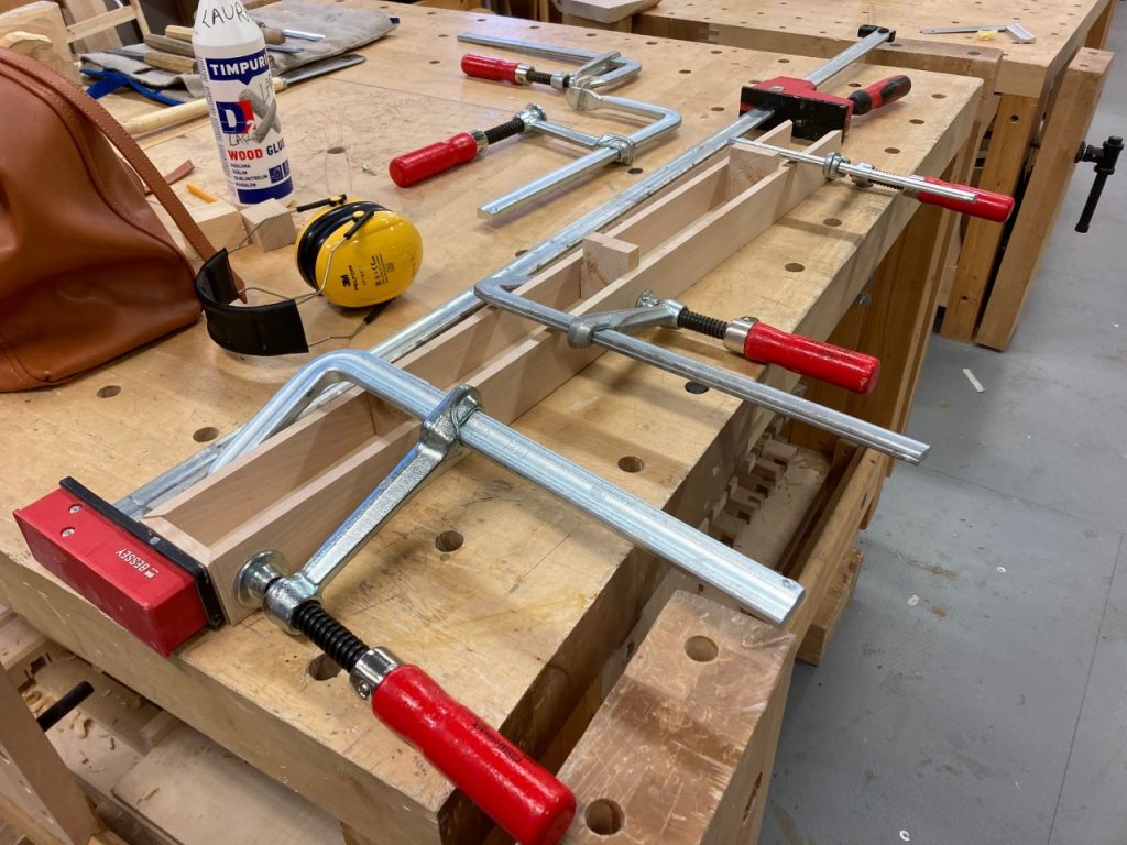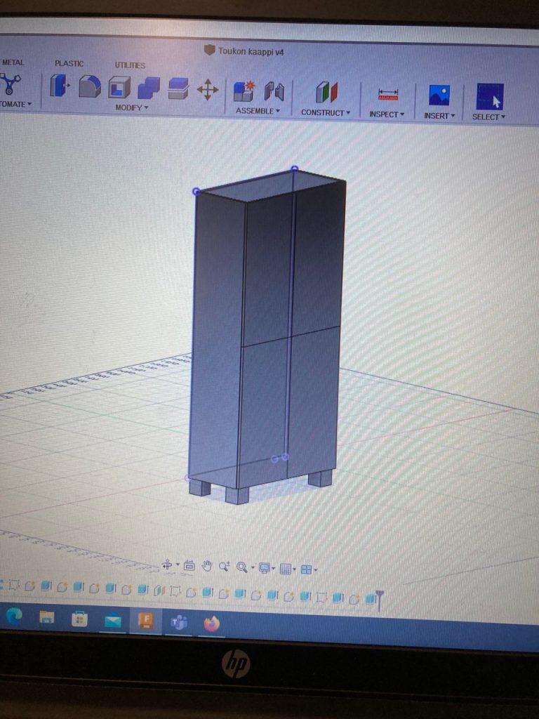 Kotelon liimausta. Kotelon reunat ovat jiirikulmassa, mikä tekee kotelon liimauksesta hiukan hankalaa. Laatikon kansi on päädystä t-kirjaimen muotoinen, joten siihen piti ajaa reunoihin syvennykset sirkkelillä, että keskiosa uppoaa laatikon sisään vähän matkaa.