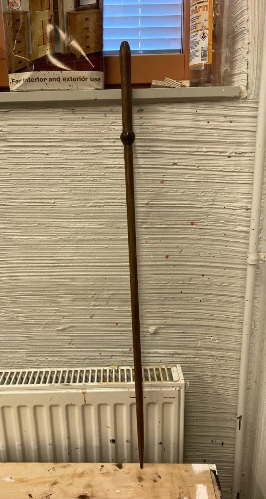Keppi on käsitelty Osmo color puuvahalla. Oli ihan mielenkiintoista kokeilla sorvaamista, joka kaiken muun ohella on minulle täysin uutta. Kädensijan sorvaaminen onnistui mielestäni kohtuullisesti. Yllätyin myös siitä, että itse keppi oli mahdollista tehdä höyläämällä. Pahinta tässä työssä oli vahaaminen, koska puuvaha oli mennyt jotenkin pilalle, eikä se meinannut kuivua ollenkaan. Laitoin sen aurinkoon parvekkeelle, joten nyt se luultavasti on kuivunut.