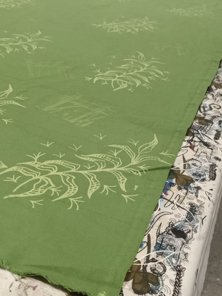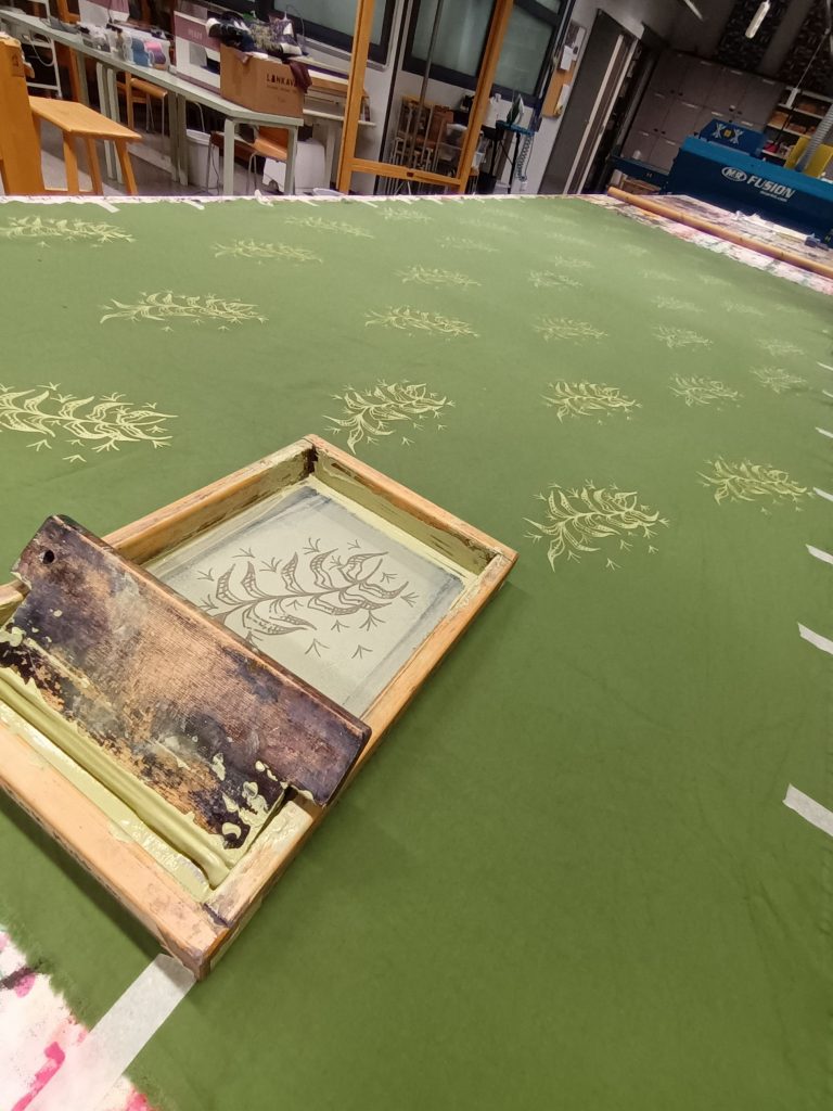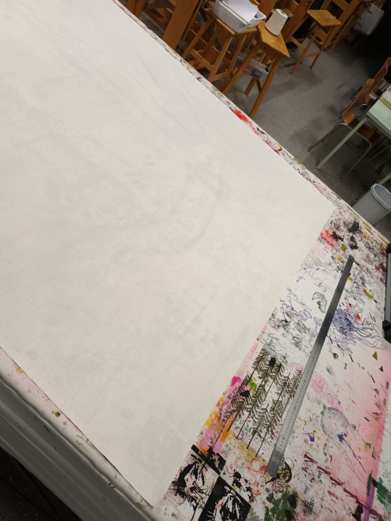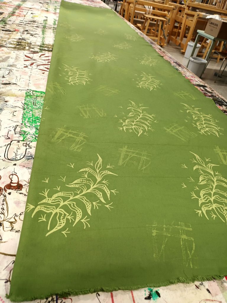 Huomasin aika nopeasti painatuksen aikana että seula tukkeutui hyvin helposti, ei tarvinnut kuin muutaman vedoksen niin huomasin kun kuvasta alkoi tulla epätarkan näköinen, opettajani kertoi että tämä johtuu painovärin valkoisesta pigmentistä jolla on taipumusta kuivua nopeasti joten minun täytyi aina muutaman kuvan jälkeen pestä seula että sain painojäljestä paljon tasaisemman, korjailin lopussa vielä pieniä kauneus virheitä tietyissä kohdissa siveltimellä joita oli hieman vaikea painattaa kankaan leveydestä johtuen, en saanut tarpeeksi painovoimaa kädelleni jotta painanta olisi onnistunut hyvin.
