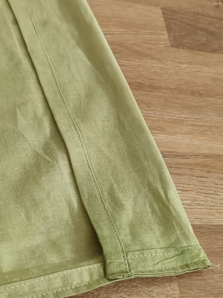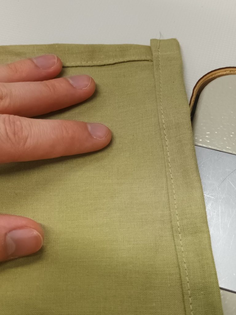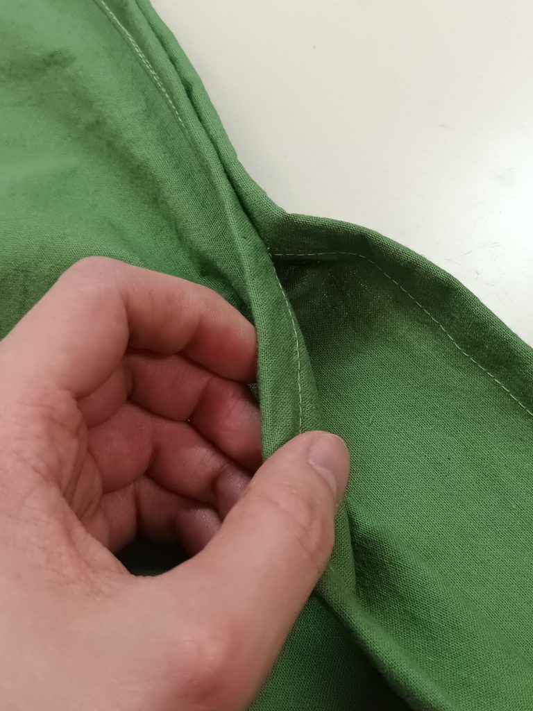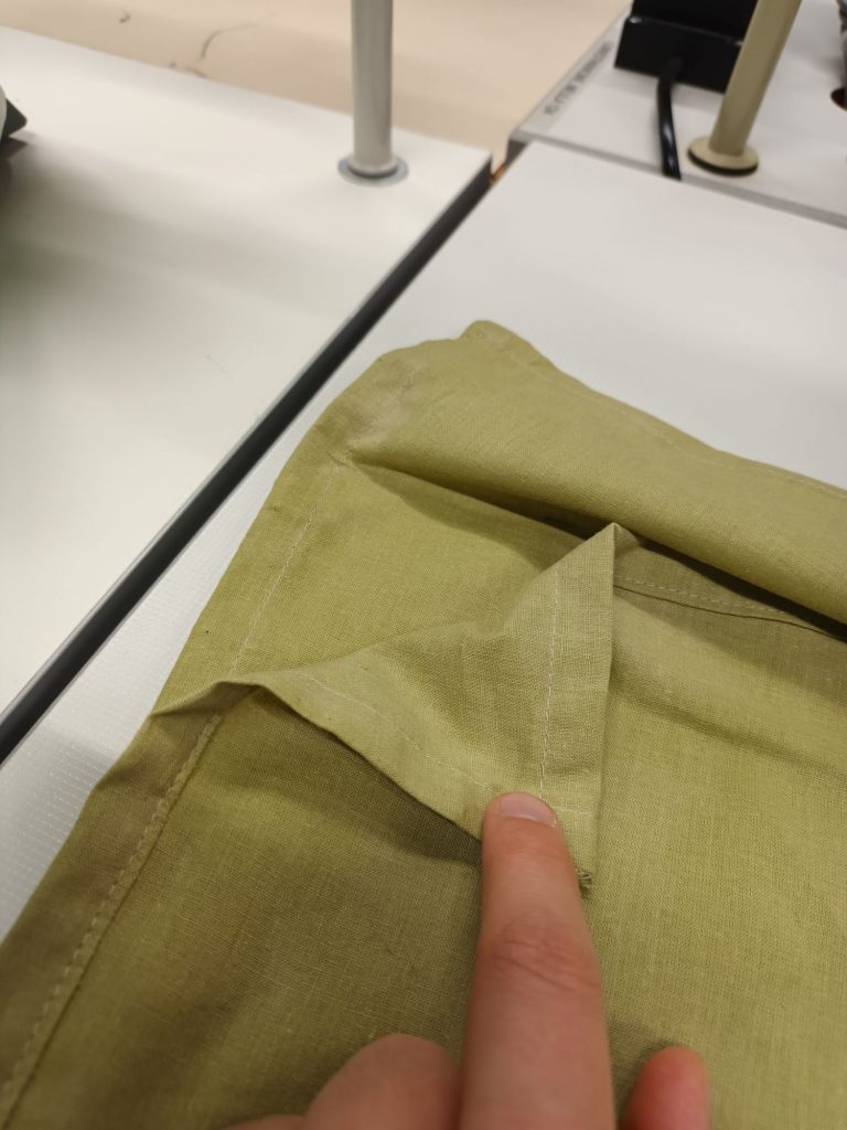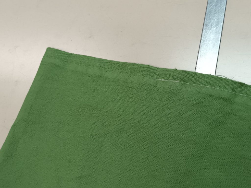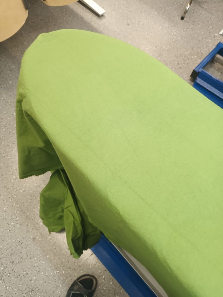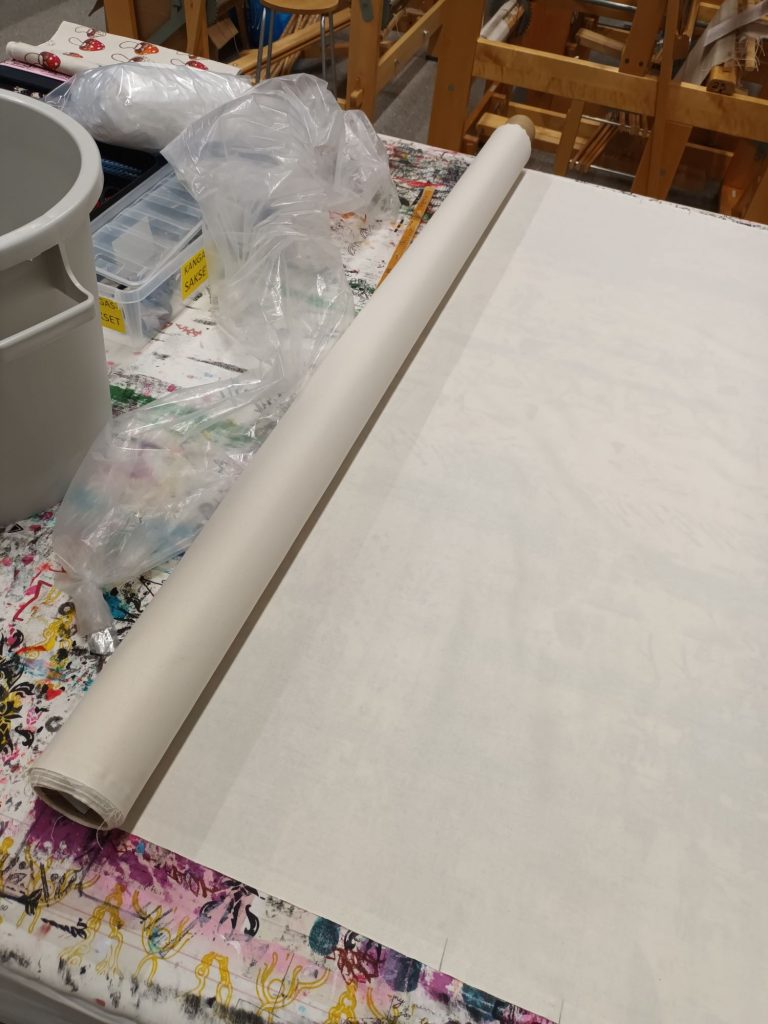 1. Aloitin työn leikkaamalla koulusta saatuani luonnon valkoista kangasta noin 4m kankaan kutistumisen huomioon ottaen.