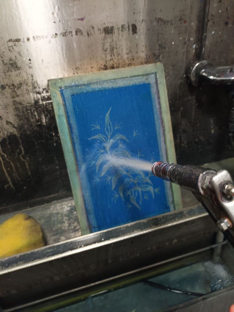 Seuraavaksi sytytin UV lampun päälle ja annoin kuvan valottua seulaan noin 9, annoin kuvan valottua noin 9 minuuttia, valotusajan päätyttyä sammutin lampun, nostin lasilevyn ja otin kalvon pois sekä kastelin kovetetun seulan heti kädenlämpöisellä vedellä molemmin puolin.