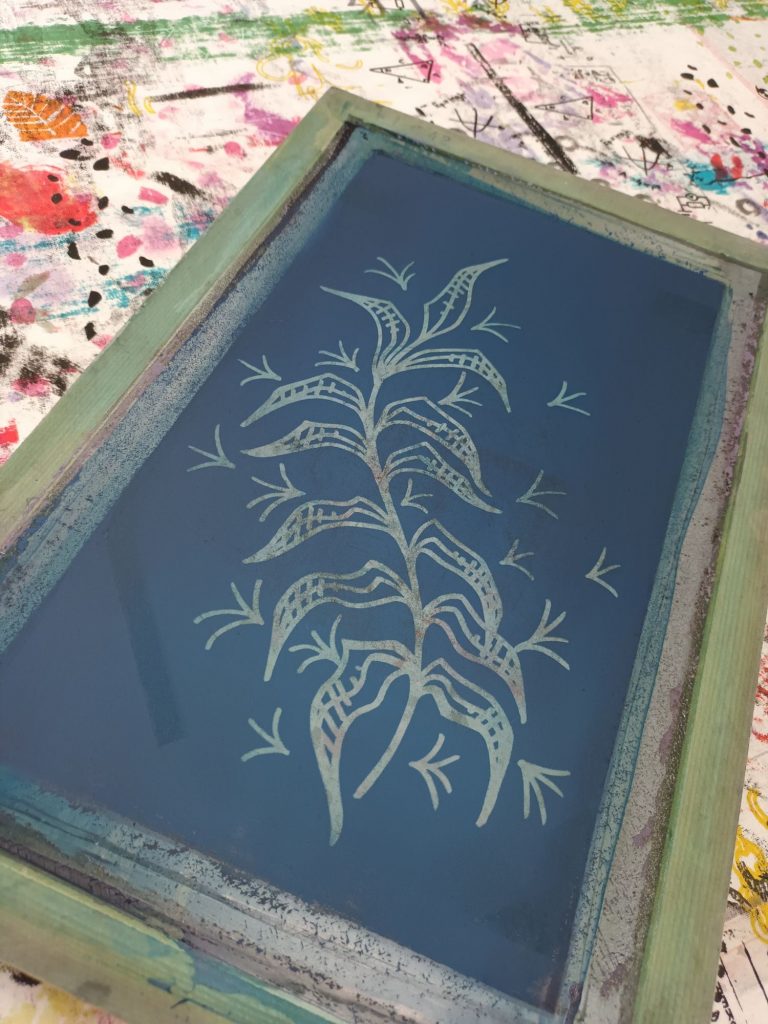 8. Laitoin lusikalla painovärin seulan yläreunaan, jonka jälkeen asetin seulan haluamalleni kohdalle johon ajattelin painaa kuvion, sitten aloin levittää painovärin raakelia käyttäen, vedin raakelilla noin 4 vedosta väriä että saan väristä mahdollisimman voimakkaan, mitä enemmän vedoksia tekee sitä voimakkaampi väristä tulee.