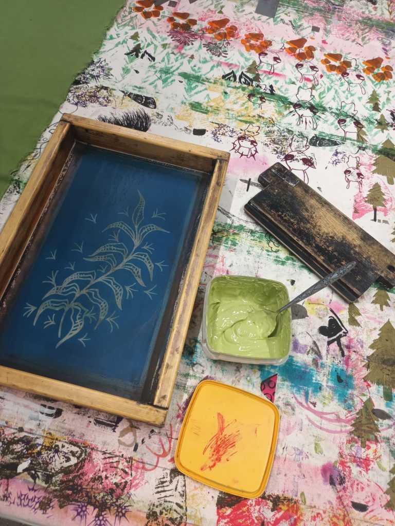 Kun löysin painovärin niin kävin hakemassa raakelin jonka avulla levitän värin tasaisesti seulaa käyttäessäni, tarvitsen myös pienen puupalikan jolla pidän seulaa hieman kallistuneessa asennossa, näin seula ei sotke pöytää painatuksen aikana kun lisään painoväriä seulaan.