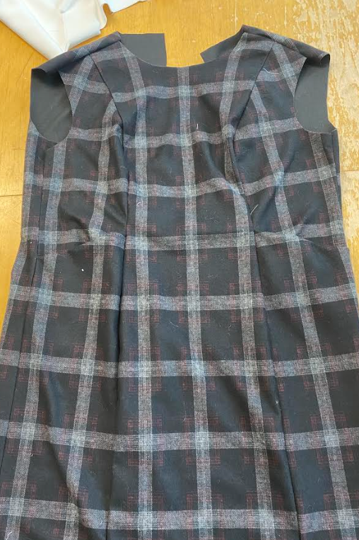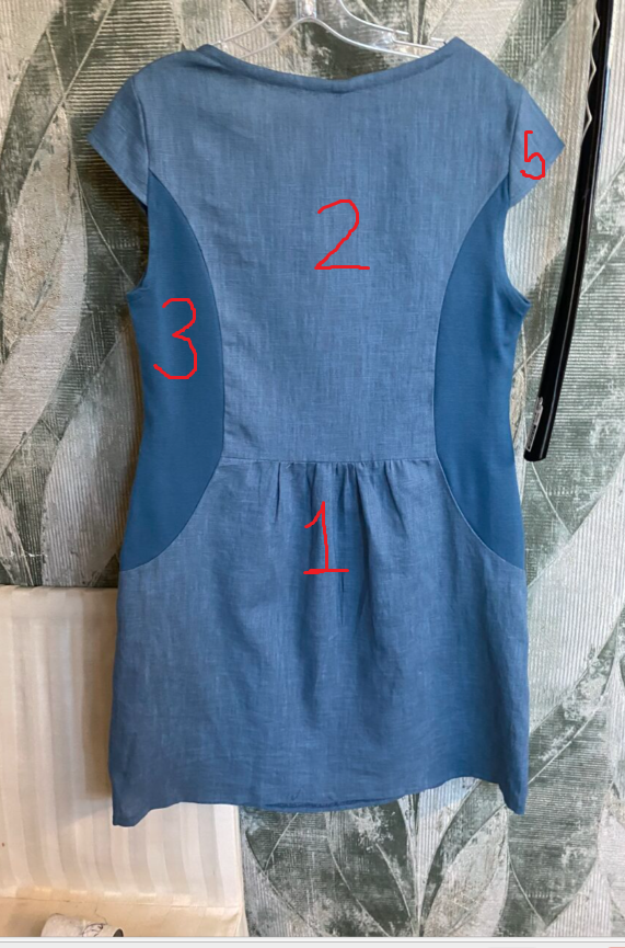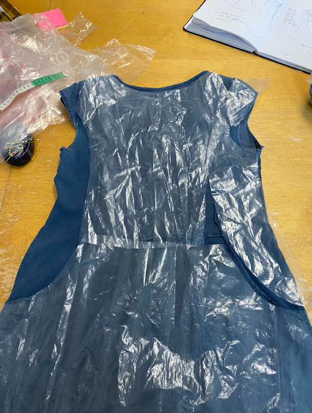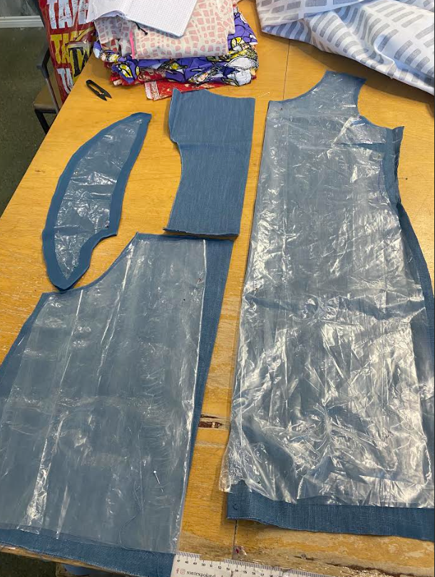 Tein mekkoa, jossa meillä oli valmiina mallimekko, josta piti kopioida kaavat. Kaavan kopioimisessa käytimme läpinäkyvää muovipaperia, jonka asettelimme mallimekon päälle ja piirsimme suoraan kaavoja. Kaavojen piirtämisen jälkeen säädimme niiden muotoa hieman ja leikkasimme osat paloiksi. Asettelimme kaavat kankaan päälle ja aloin leikata osia. Sen jälkeen aloin heti ompelemaan muotolaskoksia ja poimuttamaan takahelman osaa (1). Tikkasin myös takayläosan kiinni toisiin osiin (2) ja ompelin college-osat(3) yhteen sivuista takamiehustaan. Takaosa oli nyt valmis!